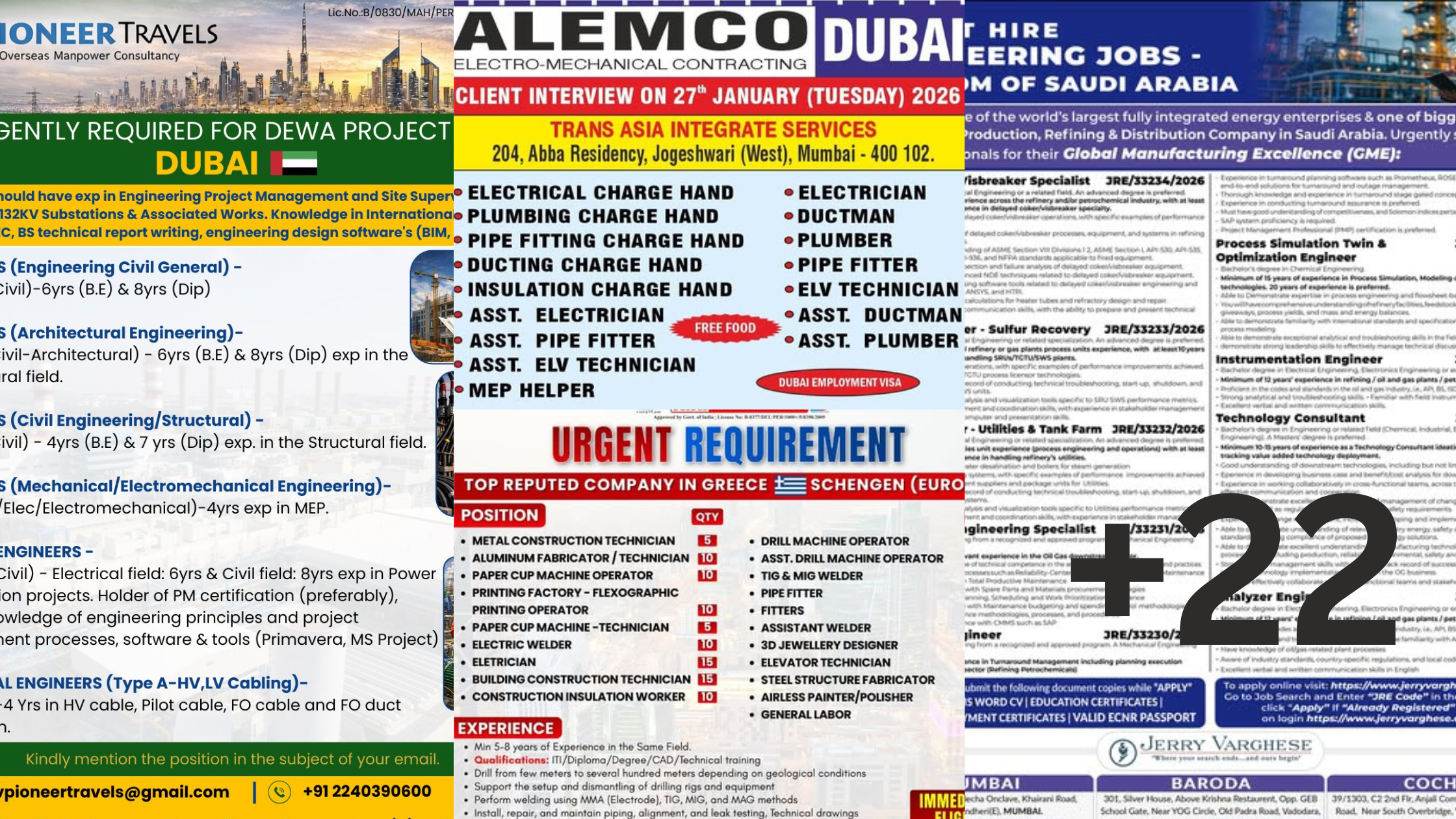 Gulf employment news paper India jobs: URGENTLY REQUIRED FOR A HYUNDAI LEADING KOREAN ENGINEERING & CONSTRUCTION COMPANY IN MIDDLE EAST. VISA READY IMMEDIATE DEPARTURE. GULF EXP PREFERRED STB UBNC PROJECT: Drivers Valid UAE license VEHICLE PLATERS/ AUTO DENTERS, PAYER LEADERS, GENERAT.  OPRTS. MOBILE CRANE OPERATORS CARGO CRANE TRUCK DRIVERS TRAILER OPERATORS/ DRIVERS MIXER TRUCK DRIVERS TRACTOR TRAILER DRIVERS LAUNDRY MEN GENERAL AFFAIRS CLERKS SECURITY GUARDS MALE NURSE STEEL FIXER CONCRETE FOREMEN PLUMBERS AC TECHNICIANS FINISHING CARPENTERS, SATELLITE INSTALLERS. UBNC PROJECT: HSE SUPERVISORS NEBOSHI IOSH/ OSHA. QC ASSISTANTS instrument KNRP PROJECT: CONTRACT ADMINISTRATORS KUSCA PROJECT CONCRETE PUMP CAR OPERATORS KALI PROJECT CIVIL ENGINEERS QALUS PROJECT QS ENGINEERS TALE PROJECT COMMISSIONING ENGINEERS FIELD OPERATORS BOARD OPERATORS LABORATORY SUPERVISORS ARNA PROJECT QA/QC COATING & INSUL. (CAT) IN SPS BAPP PROIECT WARRANTY ENGINEERS BE Mechanical in operation Maintenance with min yrs. Plant CPP s good expo on combined Siemens GT 10 yrs exp Qualified. WARRANTY ENGINEERS B.E (Mechanical) with min 10 yrs exp in Operation & Maintenance of Combined Cycle Power Plant (CCPP) & good exp on Siemens GT ST Qualified in respective discipline with min 5.10 yrs exp in Power Plant Project. For detailed Job Description Visit www.asiapower.in/jobs & search jobs according to Respective. SKD-416 CONTACT IMMEDIATELY WITH 2 SETS OF COMPLETE BIO DATA WITH ORIGINAL PASSPORT & COPIES OF TESTIMONIALS, 2 SETS COLOUR PASSPORT COPY IN ONE PAGE, VALIDITY OF PASSPORT MN 1 YR Only Shortlisted Passport will be to Attend interview at 204, Bezzola Commercial Complex opp Suman Nagar, Sion Trombay Road Chembur Mumbai 400 071.