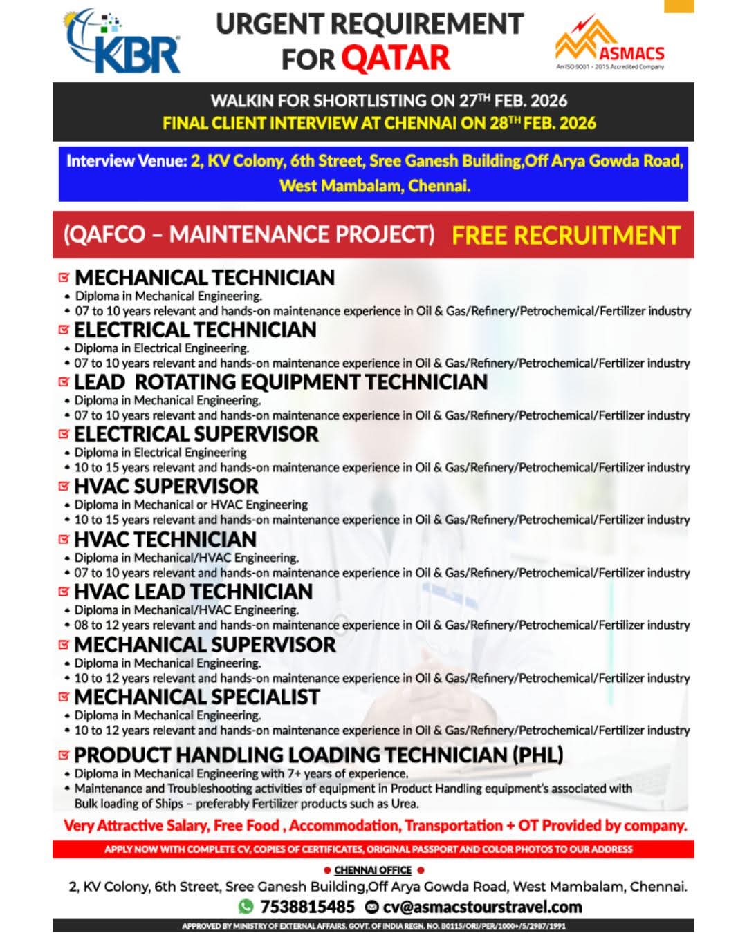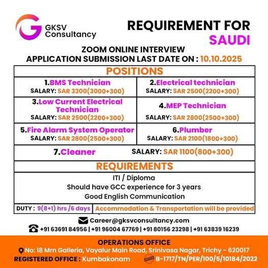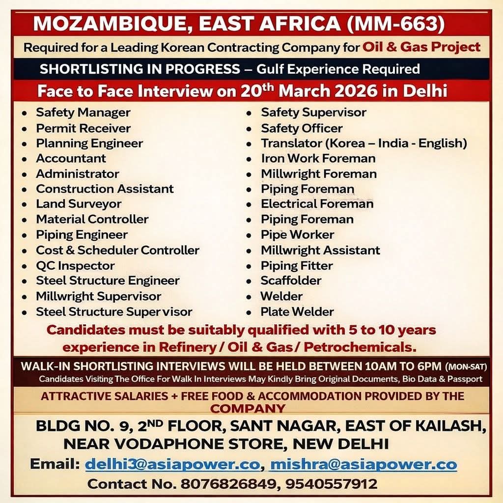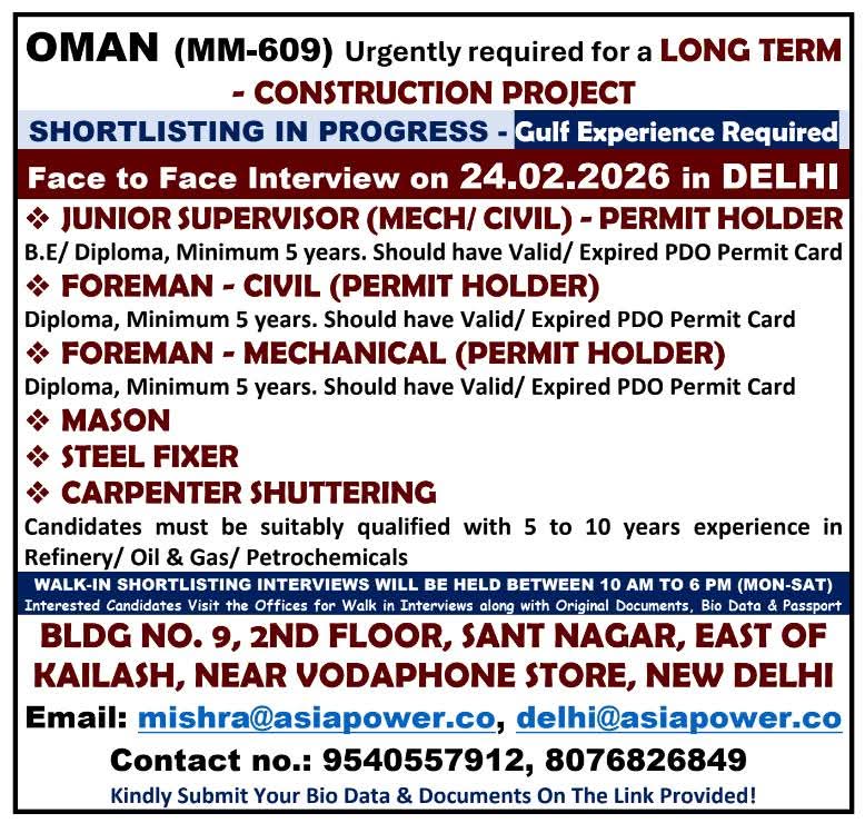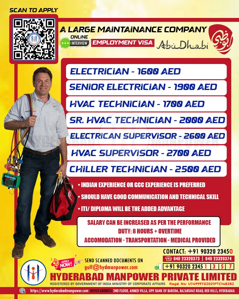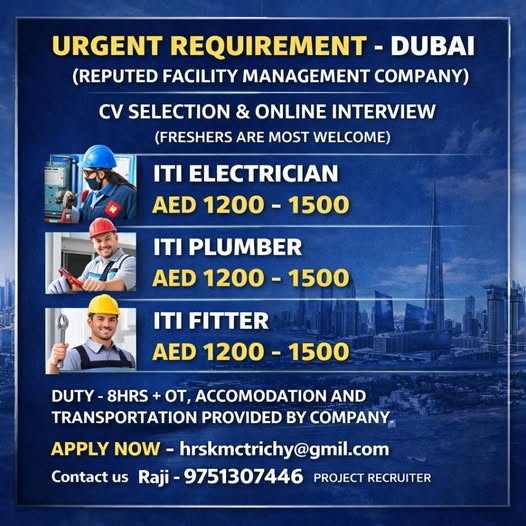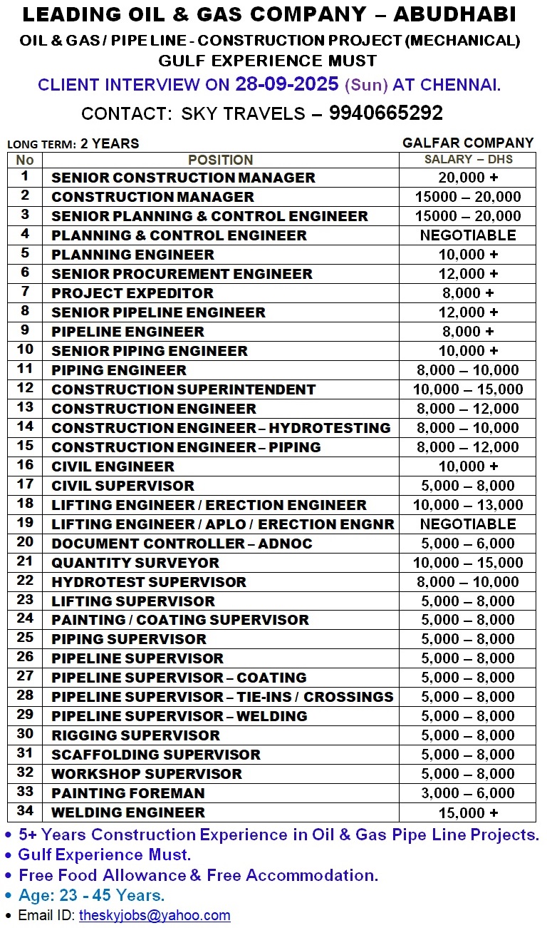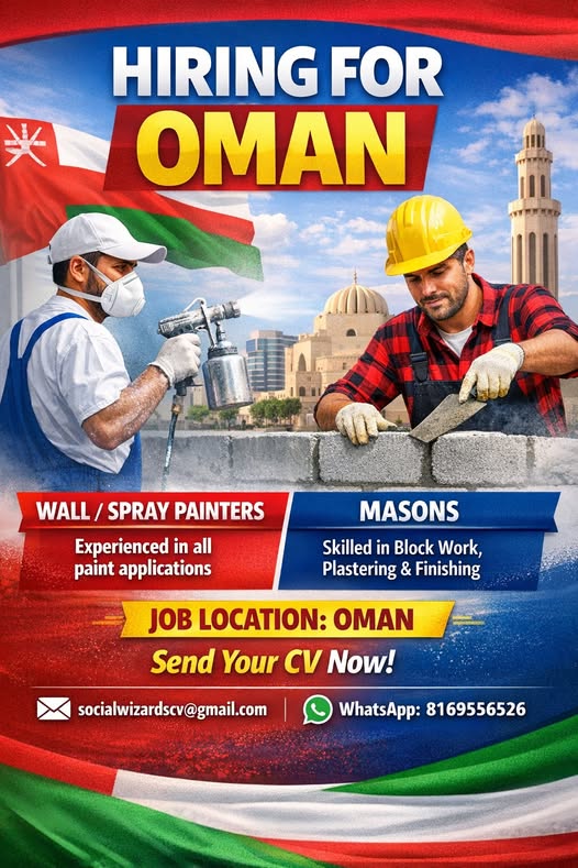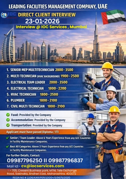 The candidates with Gulf experience are preferred. Attractive Salary package with Free Accommodation will be provided by the company itself.