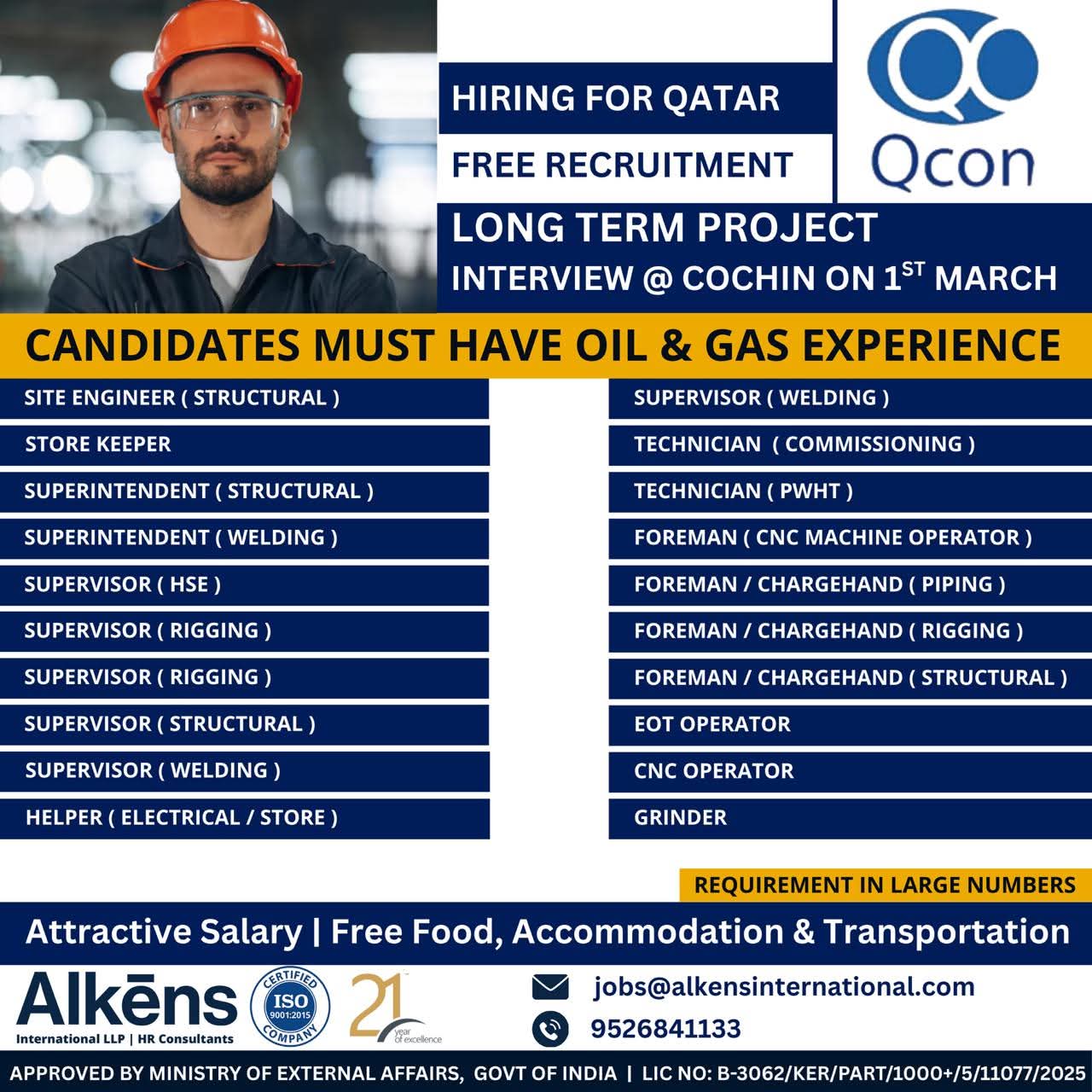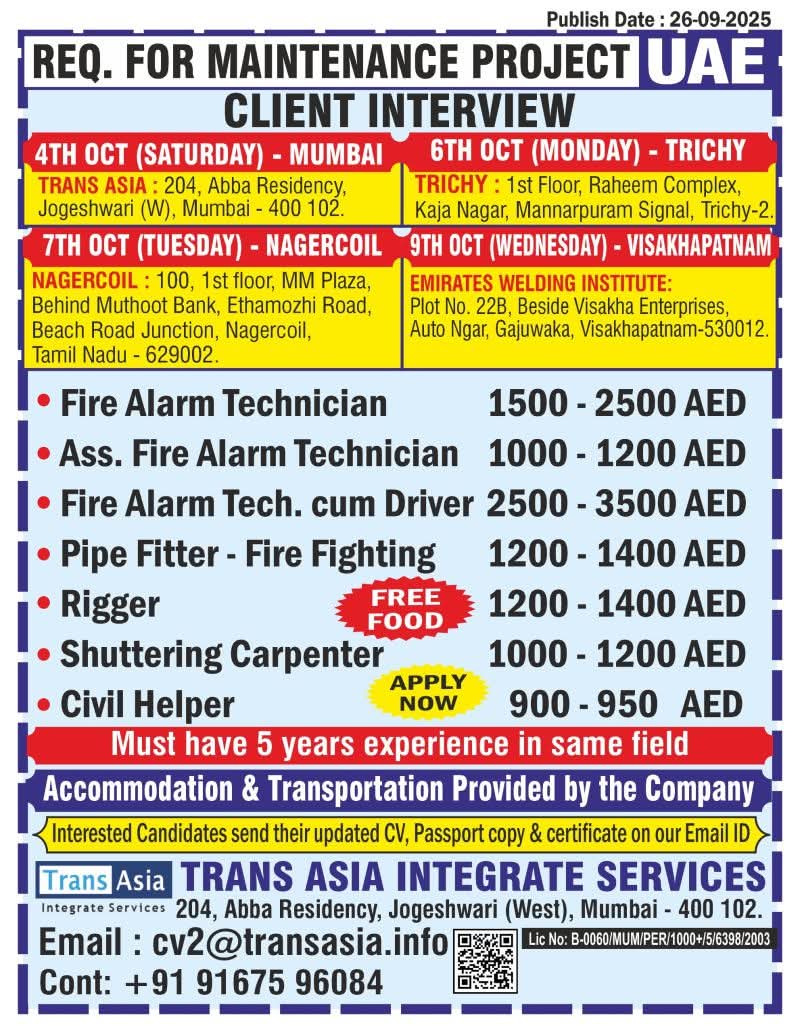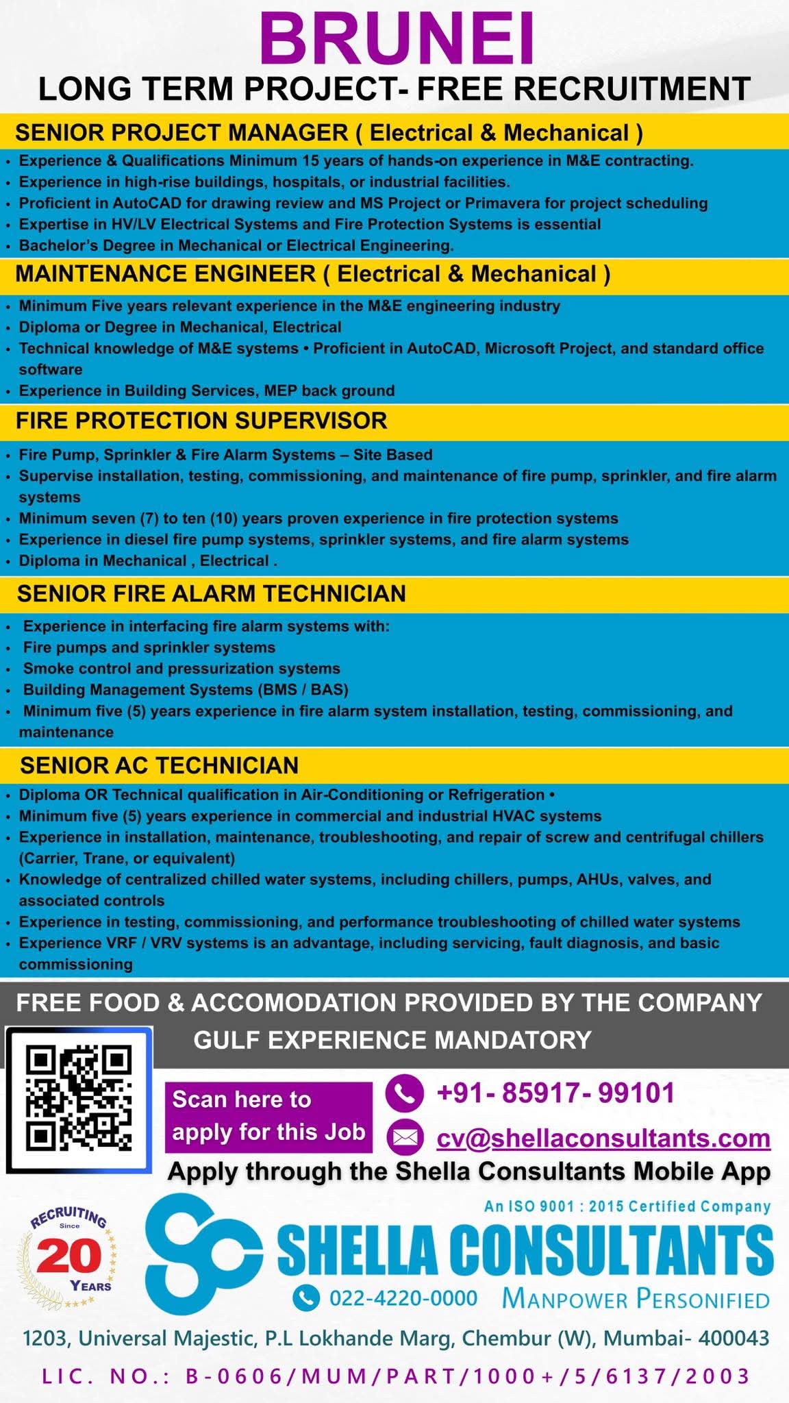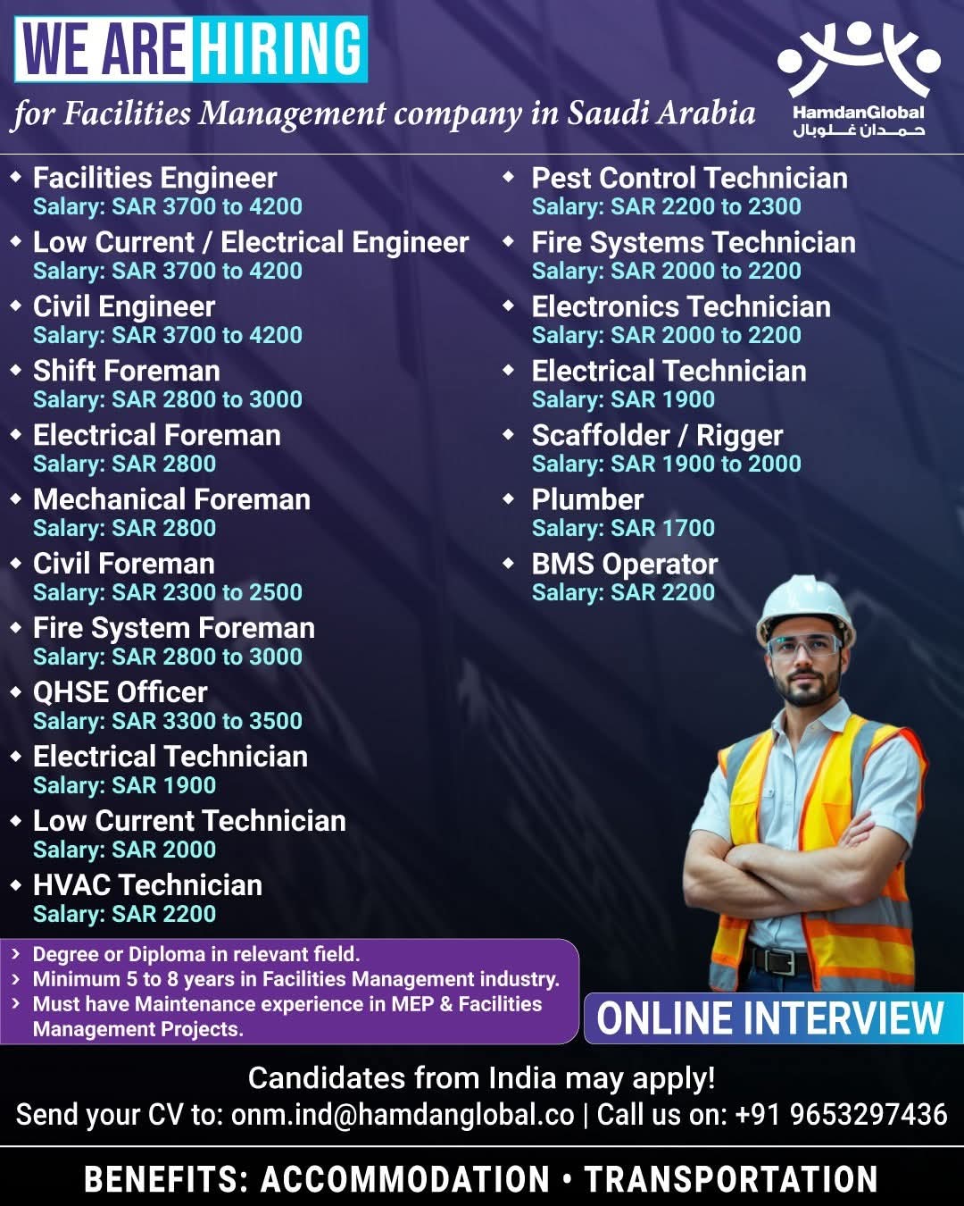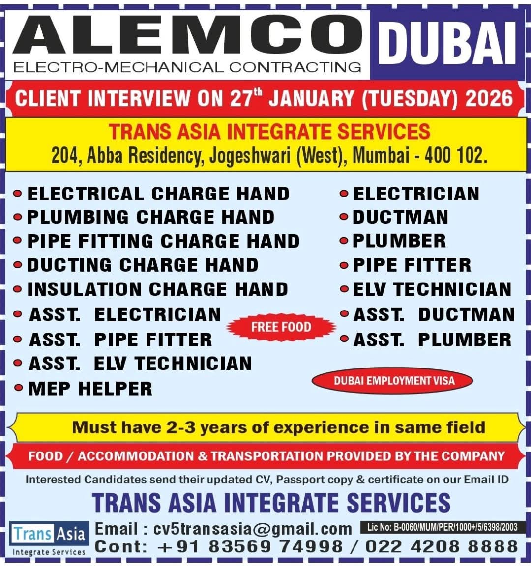 The candidates with Gulf experience are preferred. Attractive Salary package with Free Accommodation will be provided by the company itself.