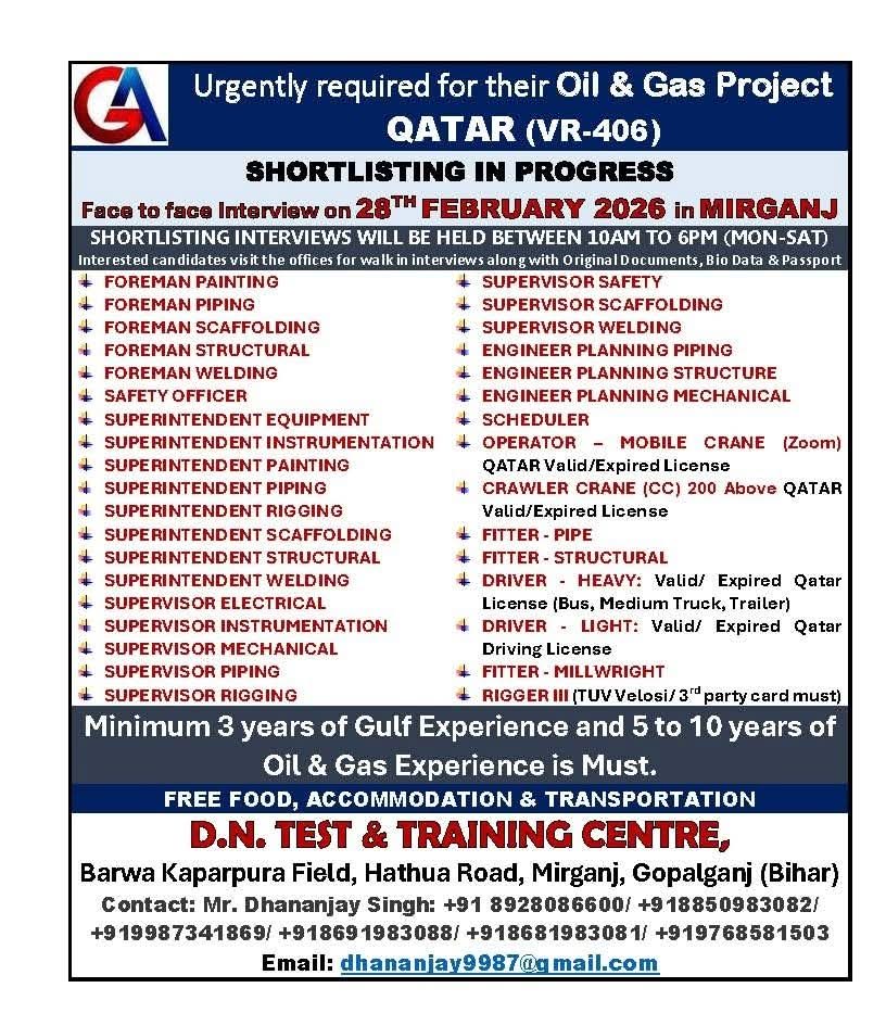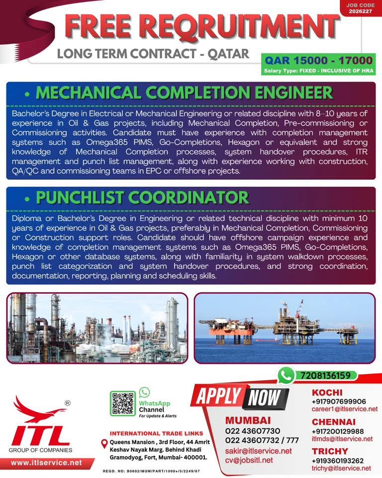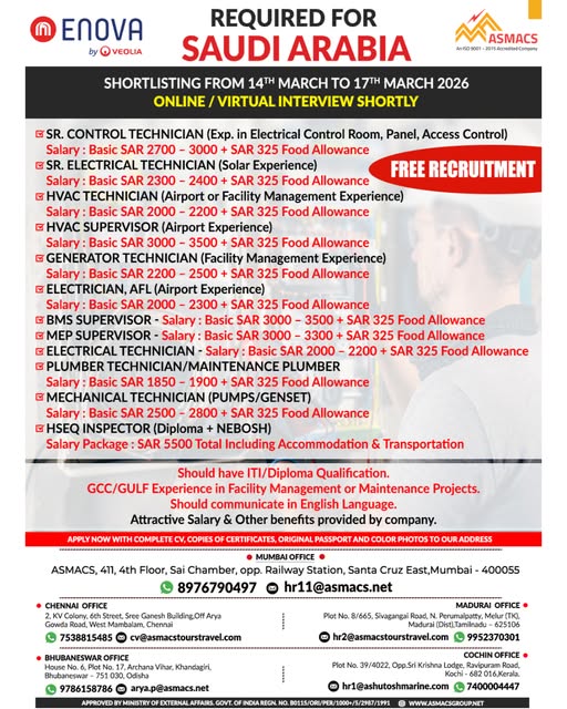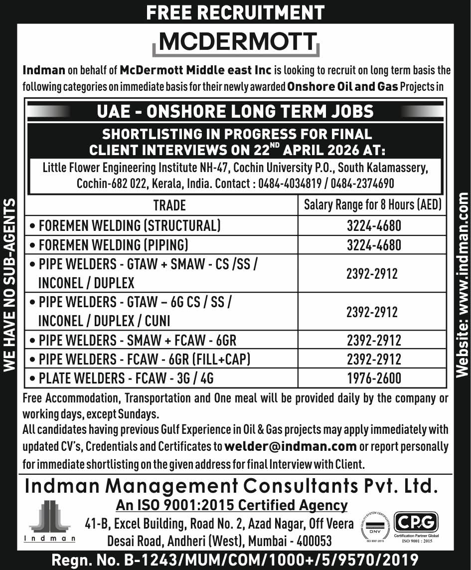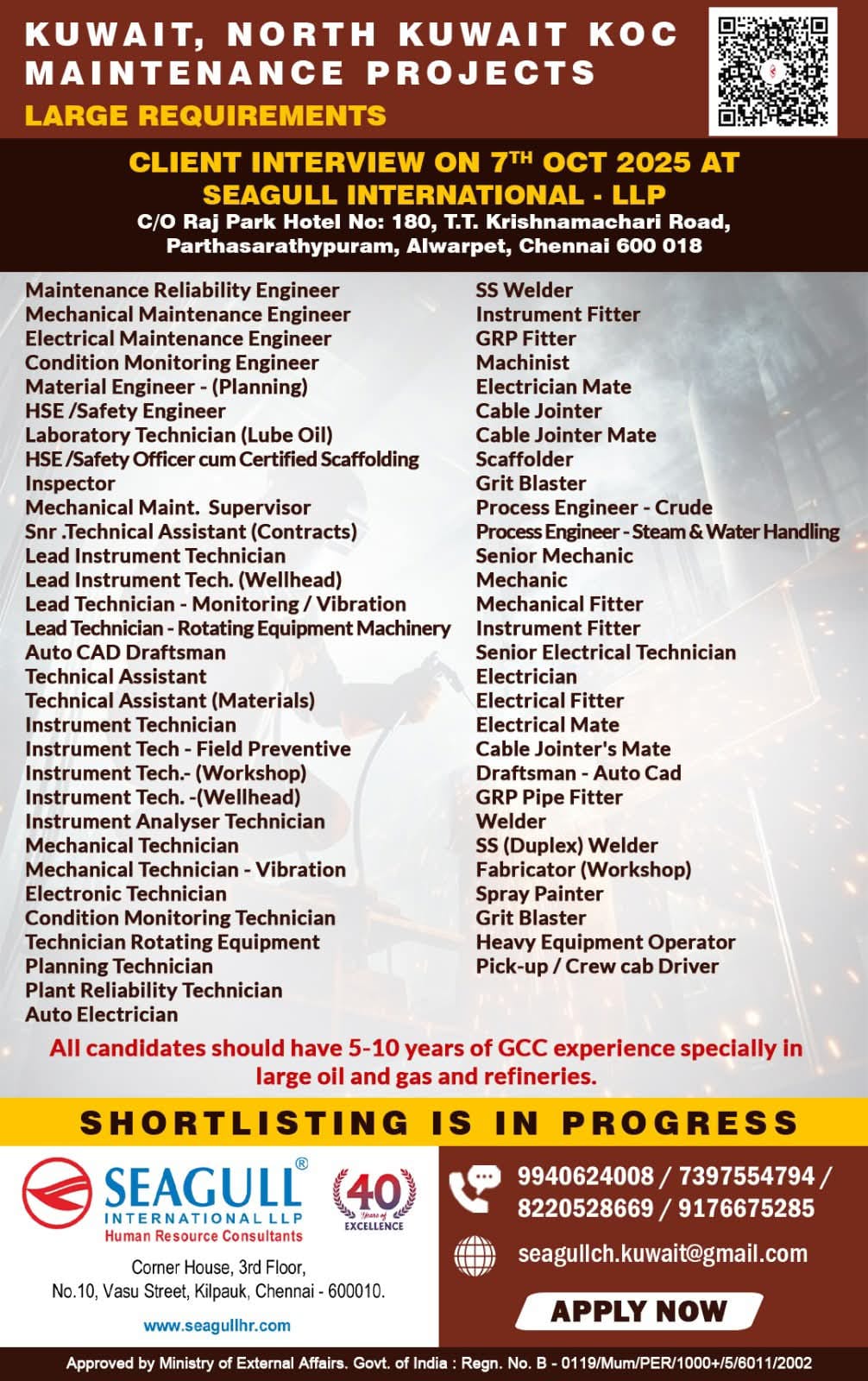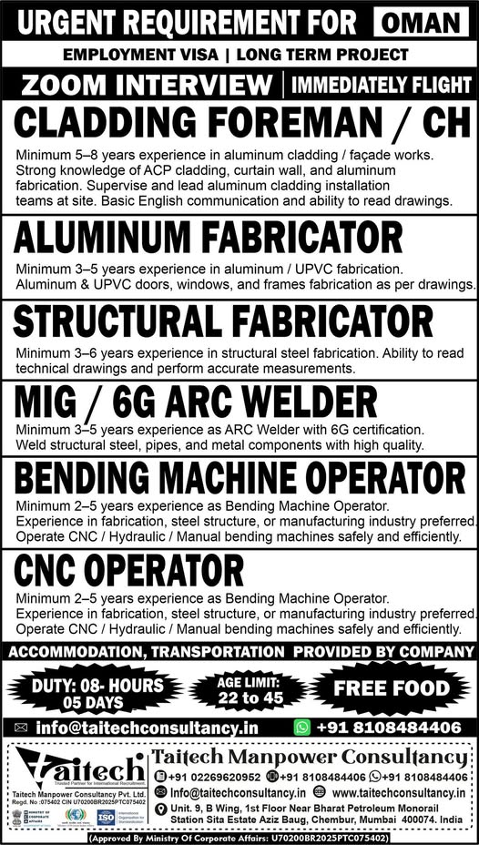 The candidates with Gulf experience are preferred. Attractive Salary package with Free Accommodation will be provided by the company itself.