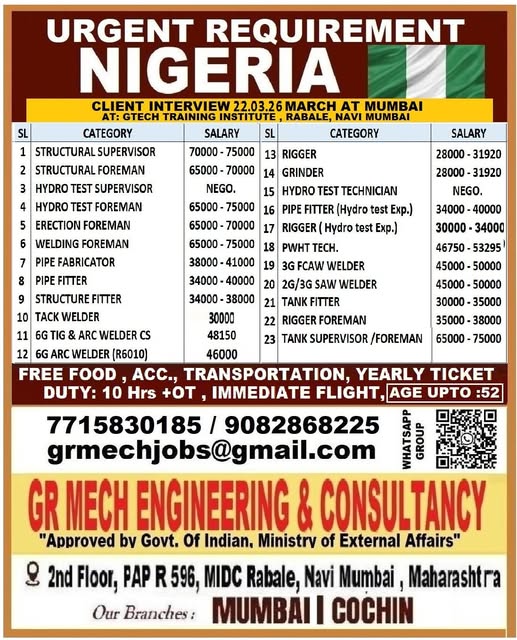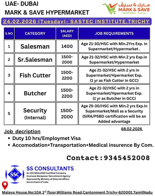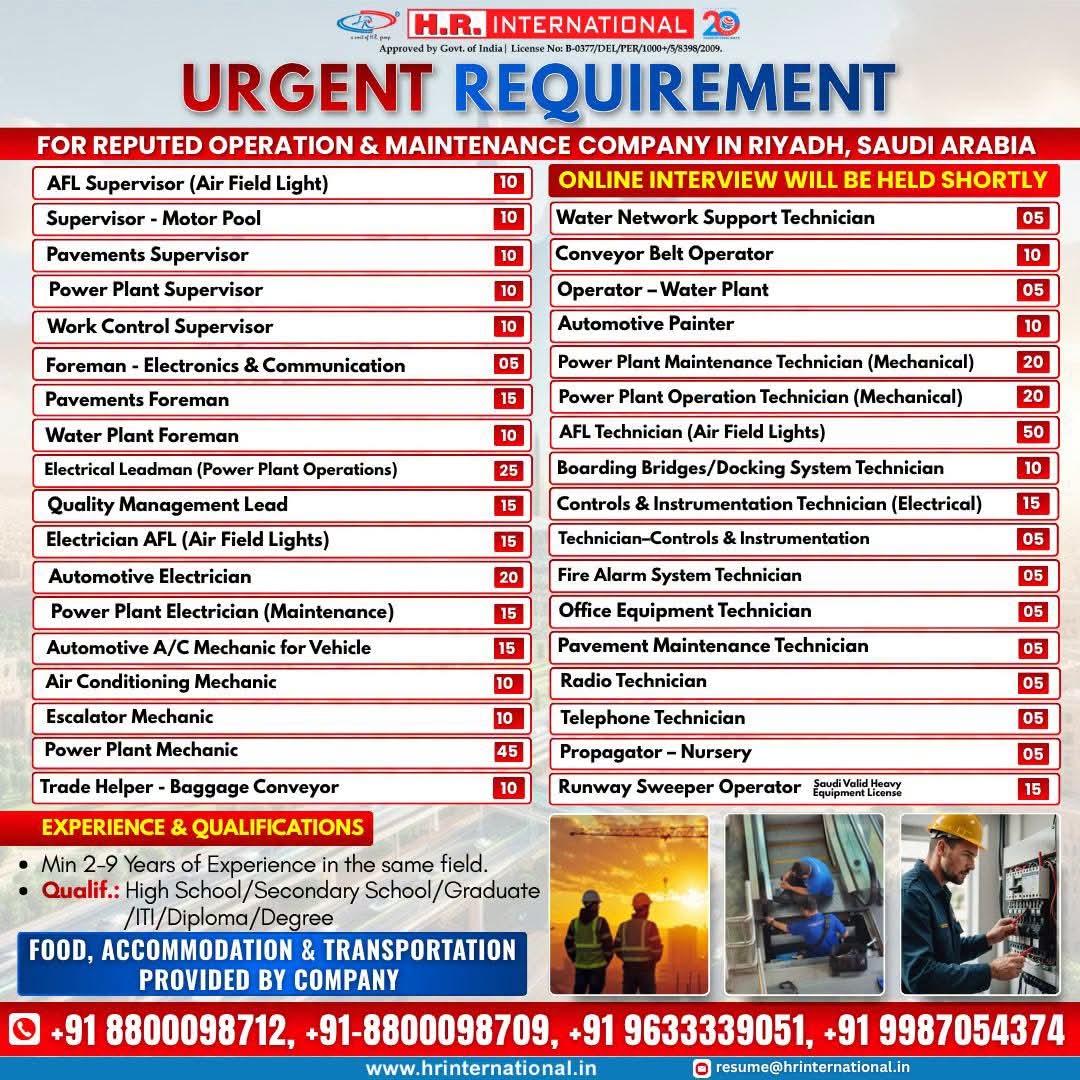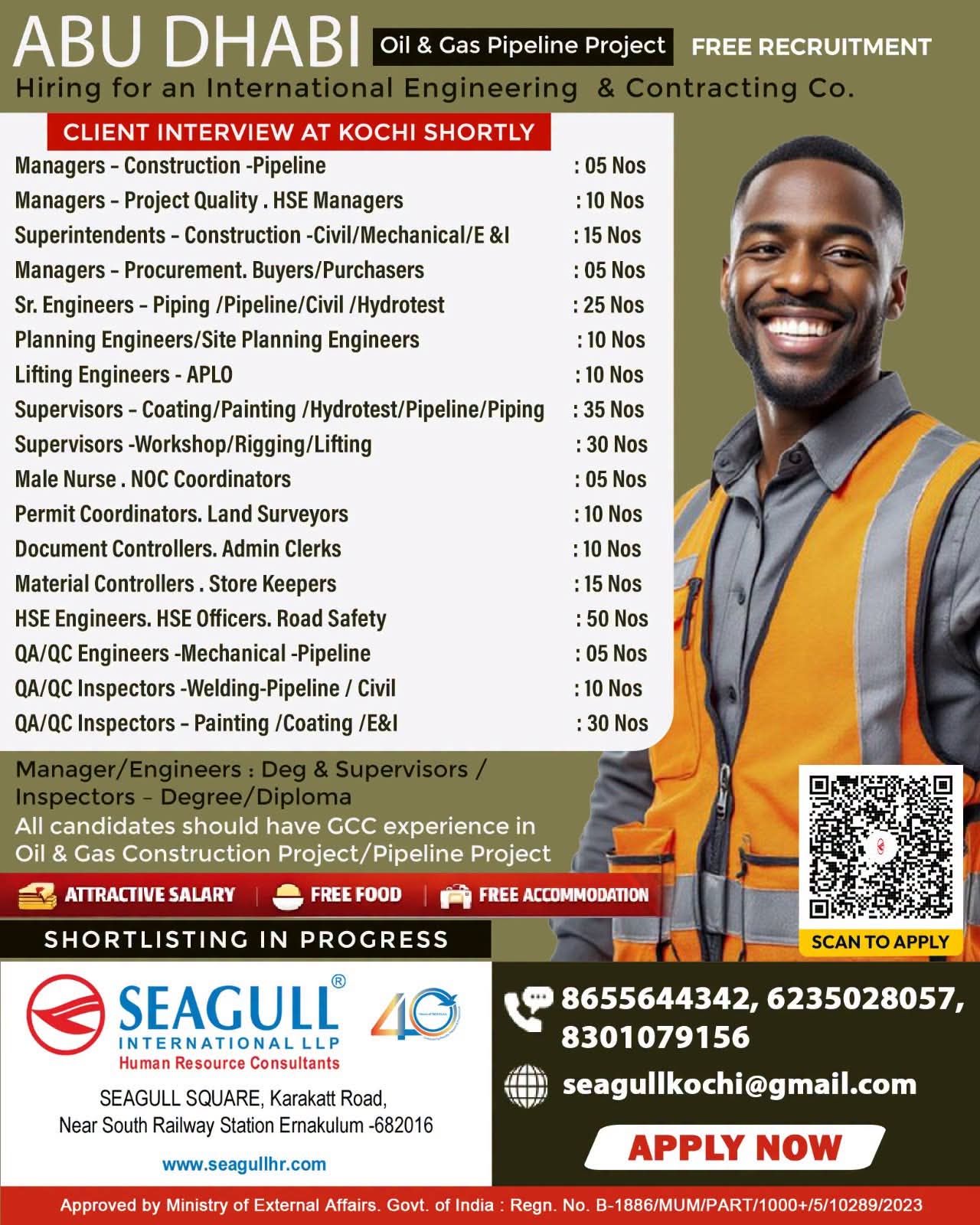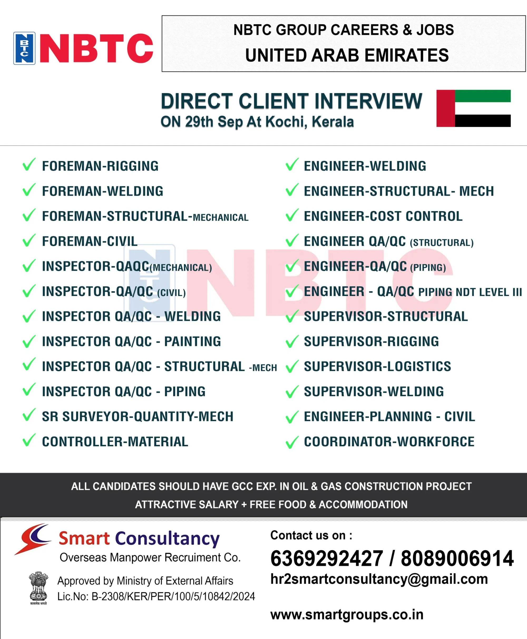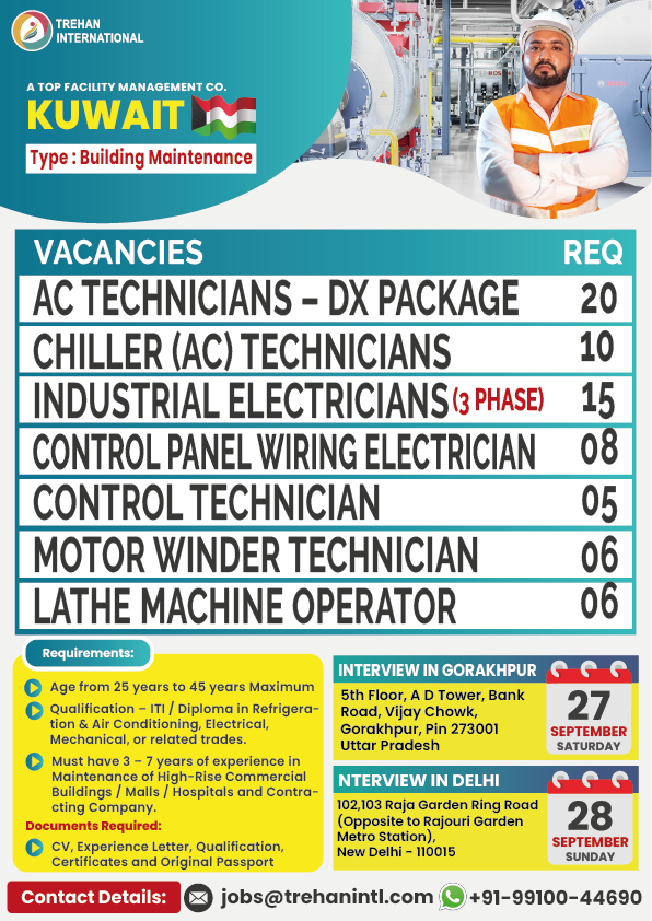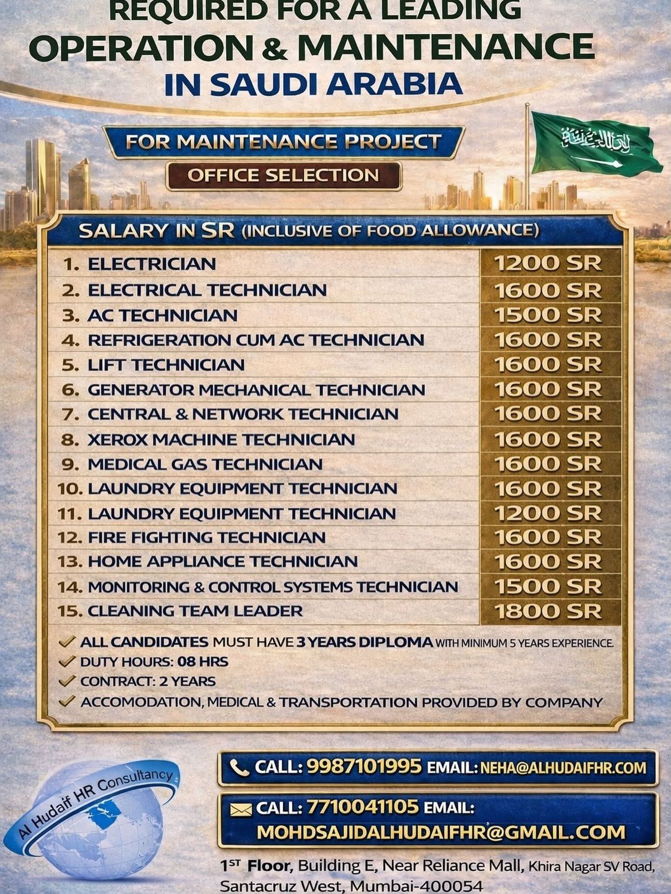 The candidates with Gulf experience are preferred. Attractive Salary package with Free Accommodation will be provided by the company itself.