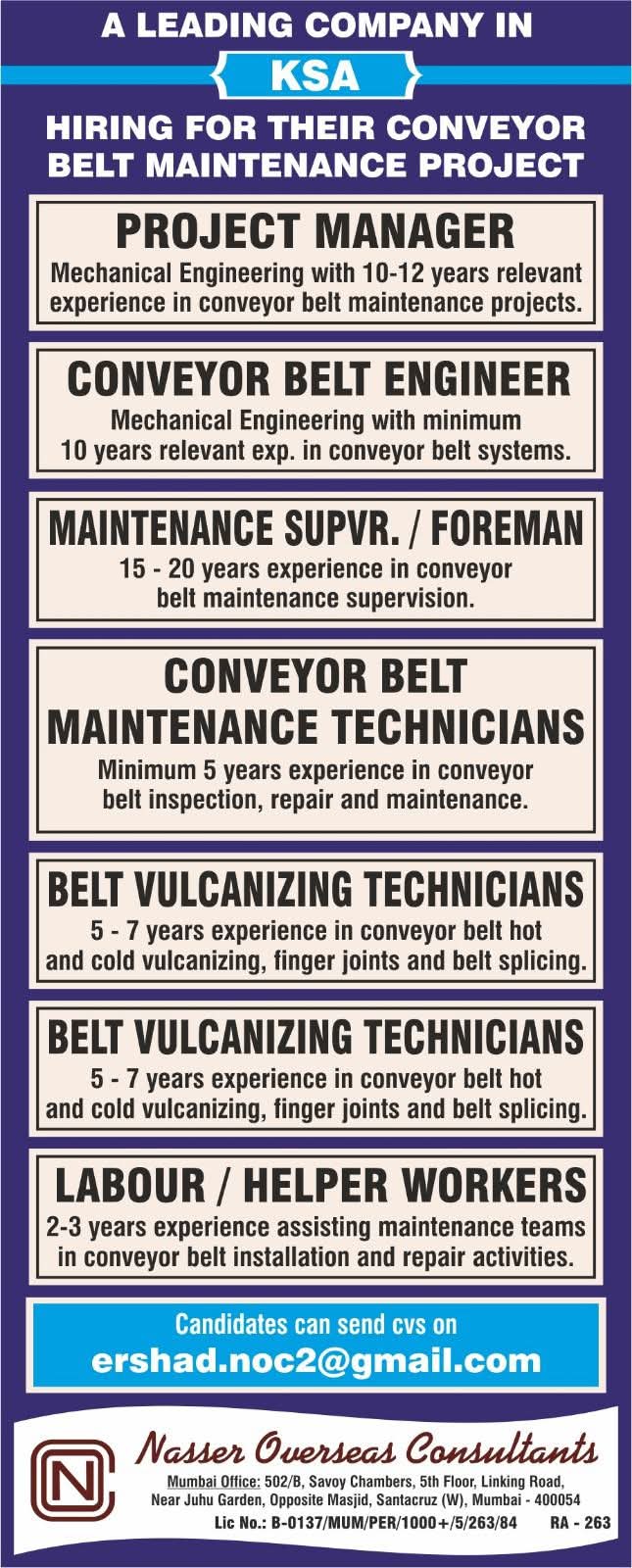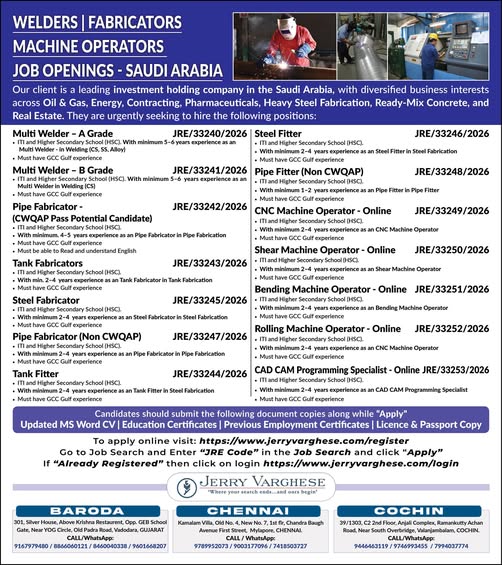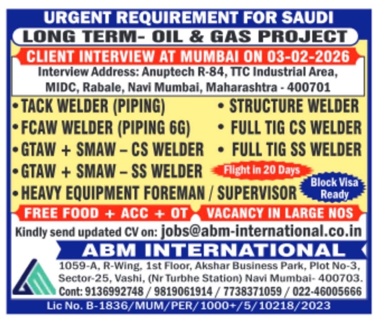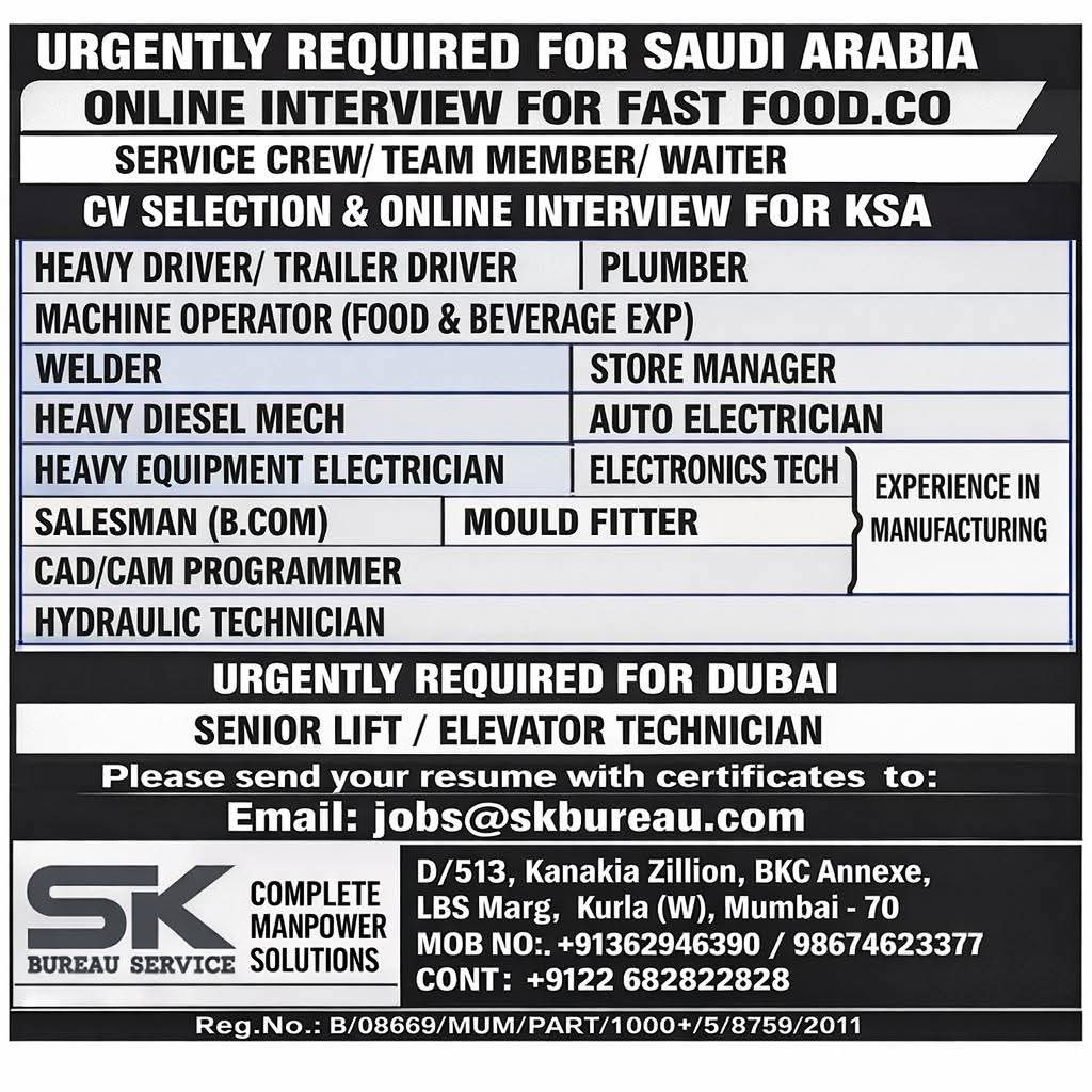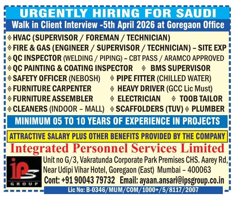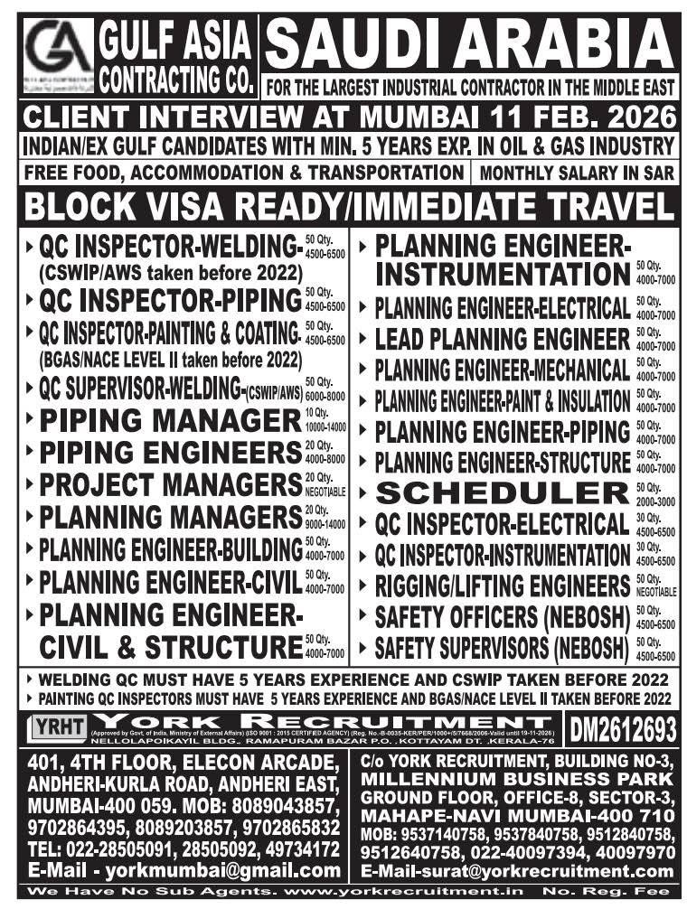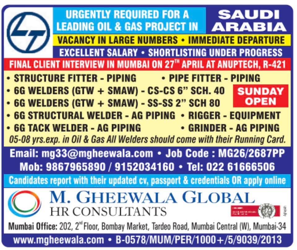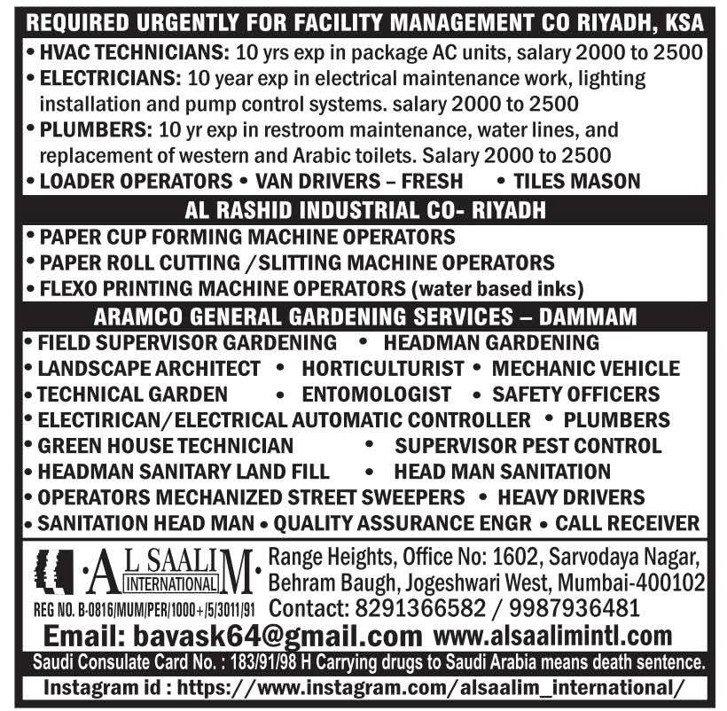 GULF EMPLOYMENT NEWSPAPER JOBS: Urgently Required for SAUDI ARABIA Min. 3 to 10 yrs preferably experience in Industry. WPR Work Permit Receiver-Aramco certificate, QA/QC Welding Engineer-Aramco Approved, QA/QC Piping Engineer-Aramco Approved, Scaffolders Labours Must with TUV Card, Scaffolding Supervisor-Aramco certificate, Support Sales Team Preferably Kerala & Degree, Indoor Salesman Preferably Kerala & Degree, Quality Engineer Experience at least 5 years in Concrete Batching Plant and Raw material, Lab Technician-Exp. in Concrete Batching plant, Pump operator-Exp. in Concrete Batching plant, Batching Plant operator-Exp. at least 2 years. Laundry Man/operators, Autocad -3D- Civil, Dozer operator, Haris/Watchman, Chef/Cooks, Return House Drivers Asst. Cooks, Pastry Chef/Bakers, Secretary, Unit Managers-Experience in catering. Block Visa Ready. Immediate Departure. Bring your CV Photos & Original Passport along with you. FAISA MANAGEMENT SERVICES Esjay House, Level 1 RM 4, Below Barkat English School, Maulana Azad Road Byculla Mumbai400 010. Tel 022 2307373, Mob 9022355544