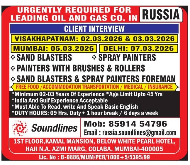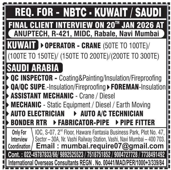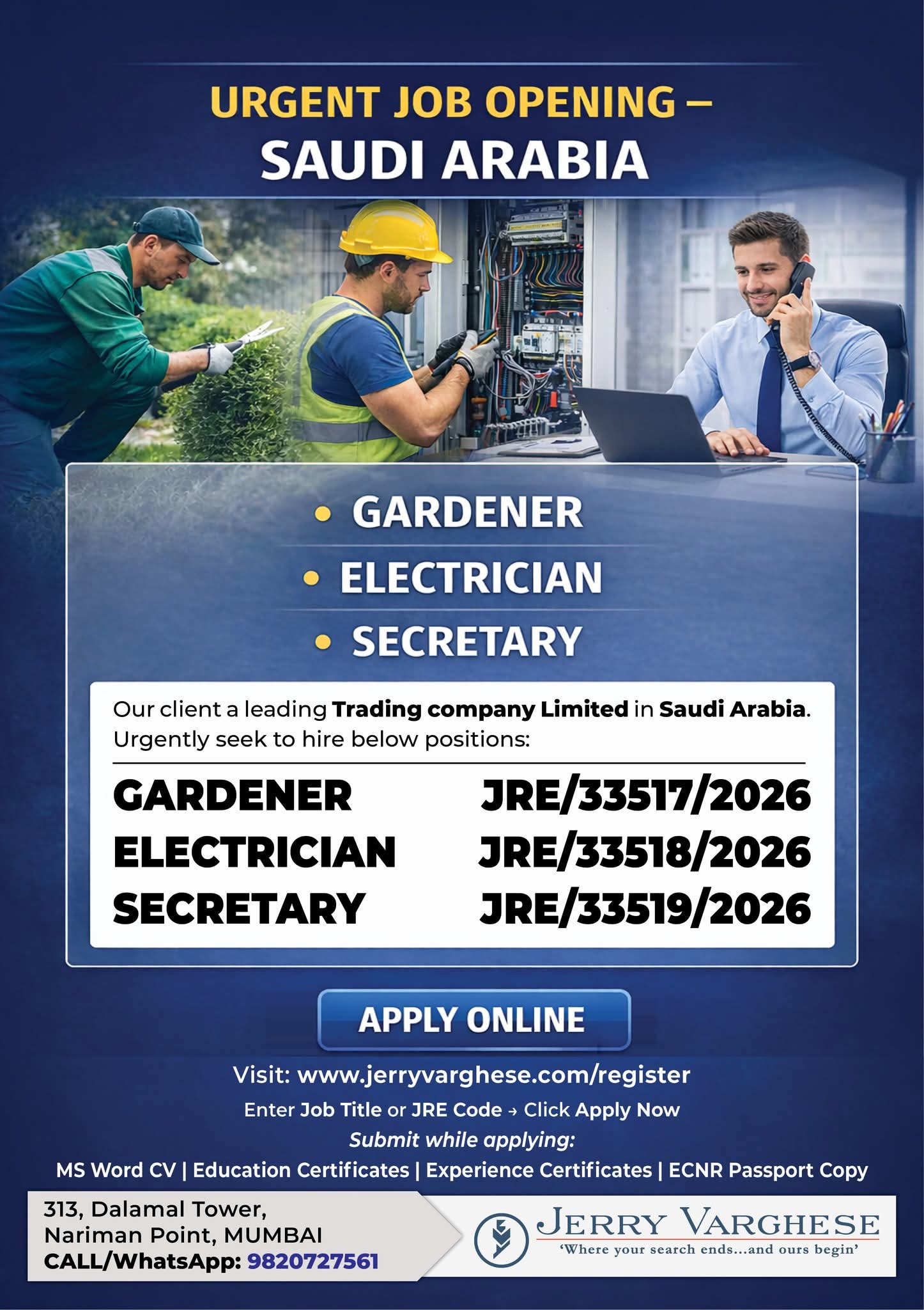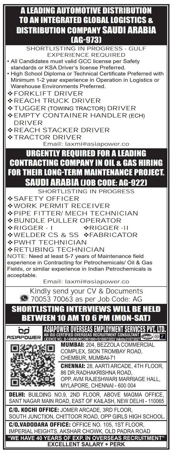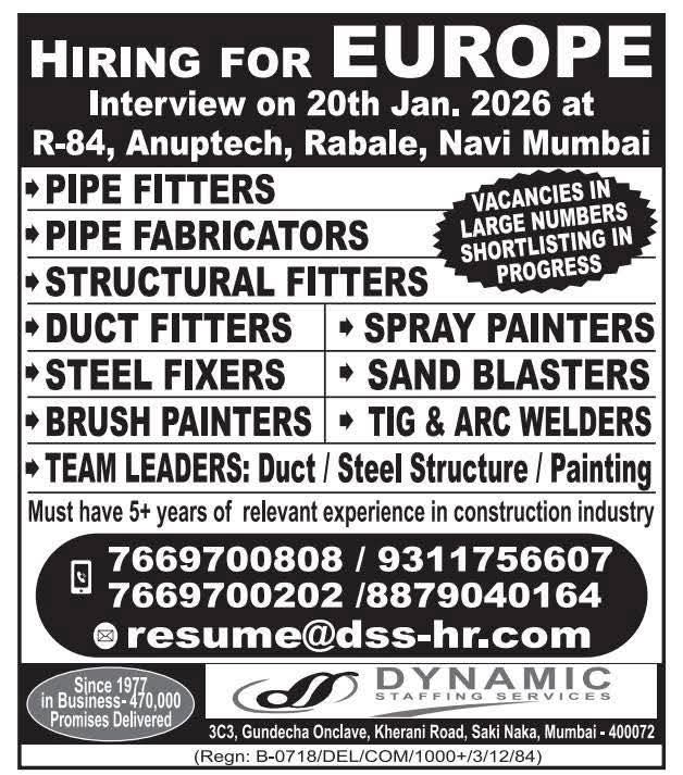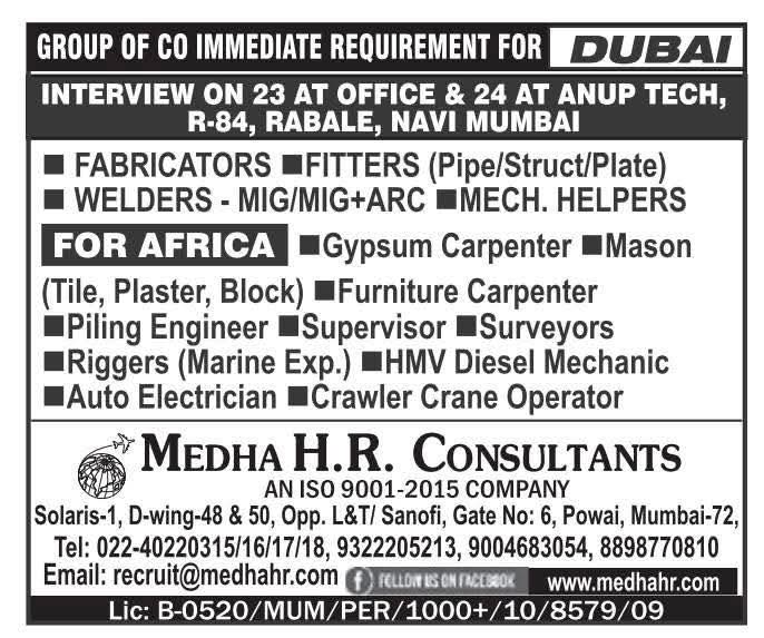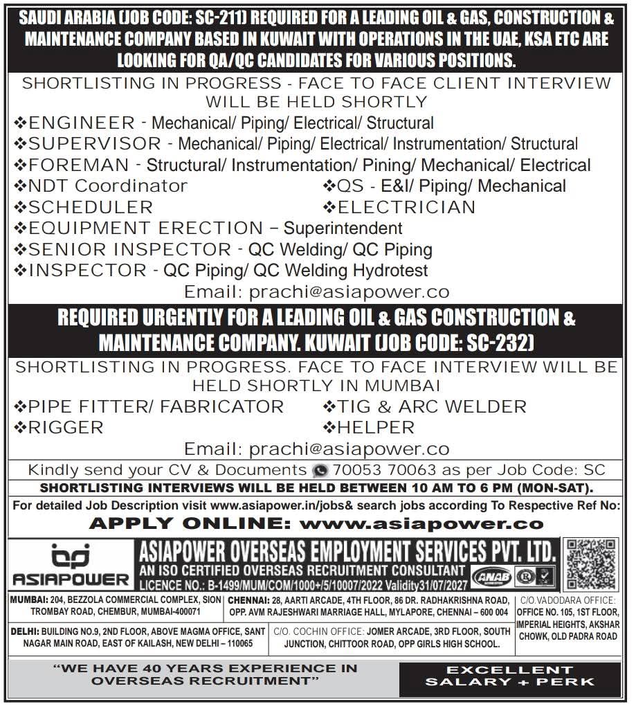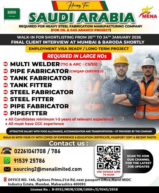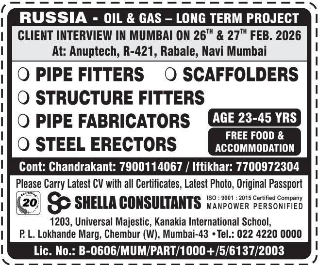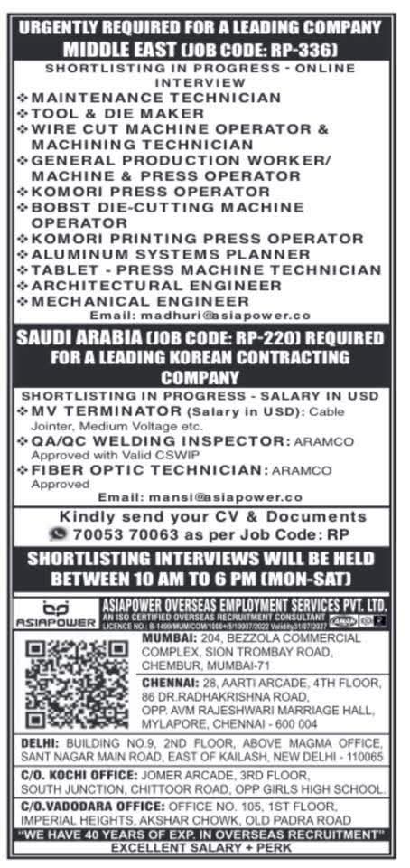 GULF EMPLOYMENT NEWSPAPER JOBS: Urgently Required for SAUDI ARABIA Min. 3 to 10 yrs preferably experience in Industry. WPR Work Permit Receiver-Aramco certificate, QA/QC Welding Engineer-Aramco Approved, QA/QC Piping Engineer-Aramco Approved, Scaffolders Labours Must with TUV Card, Scaffolding Supervisor-Aramco certificate, Support Sales Team Preferably Kerala & Degree, Indoor Salesman Preferably Kerala & Degree, Quality Engineer Experience at least 5 years in Concrete Batching Plant and Raw material, Lab Technician-Exp. in Concrete Batching plant, Pump operator-Exp. in Concrete Batching plant, Batching Plant operator-Exp. at least 2 years. Laundry Man/operators, Autocad -3D- Civil, Dozer operator, Haris/Watchman, Chef/Cooks, Return House Drivers Asst. Cooks, Pastry Chef/Bakers, Secretary, Unit Managers-Experience in catering. Block Visa Ready. Immediate Departure. Bring your CV Photos & Original Passport along with you. FAISA MANAGEMENT SERVICES Esjay House, Level 1 RM 4, Below Barkat English School, Maulana Azad Road Byculla Mumbai400 010. Tel 022 2307373, Mob 9022355544