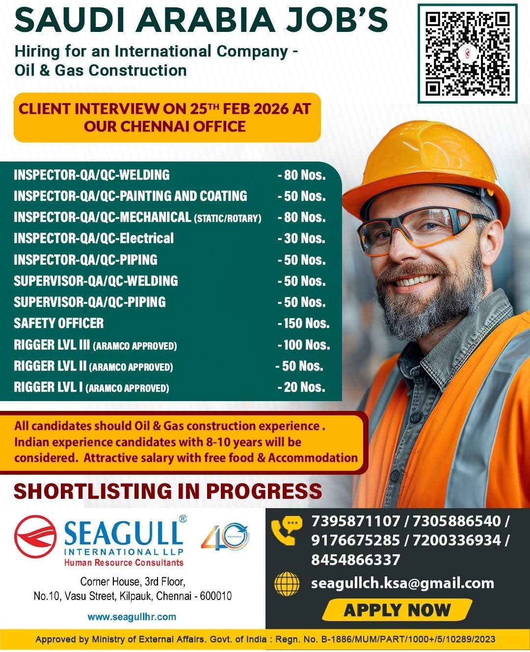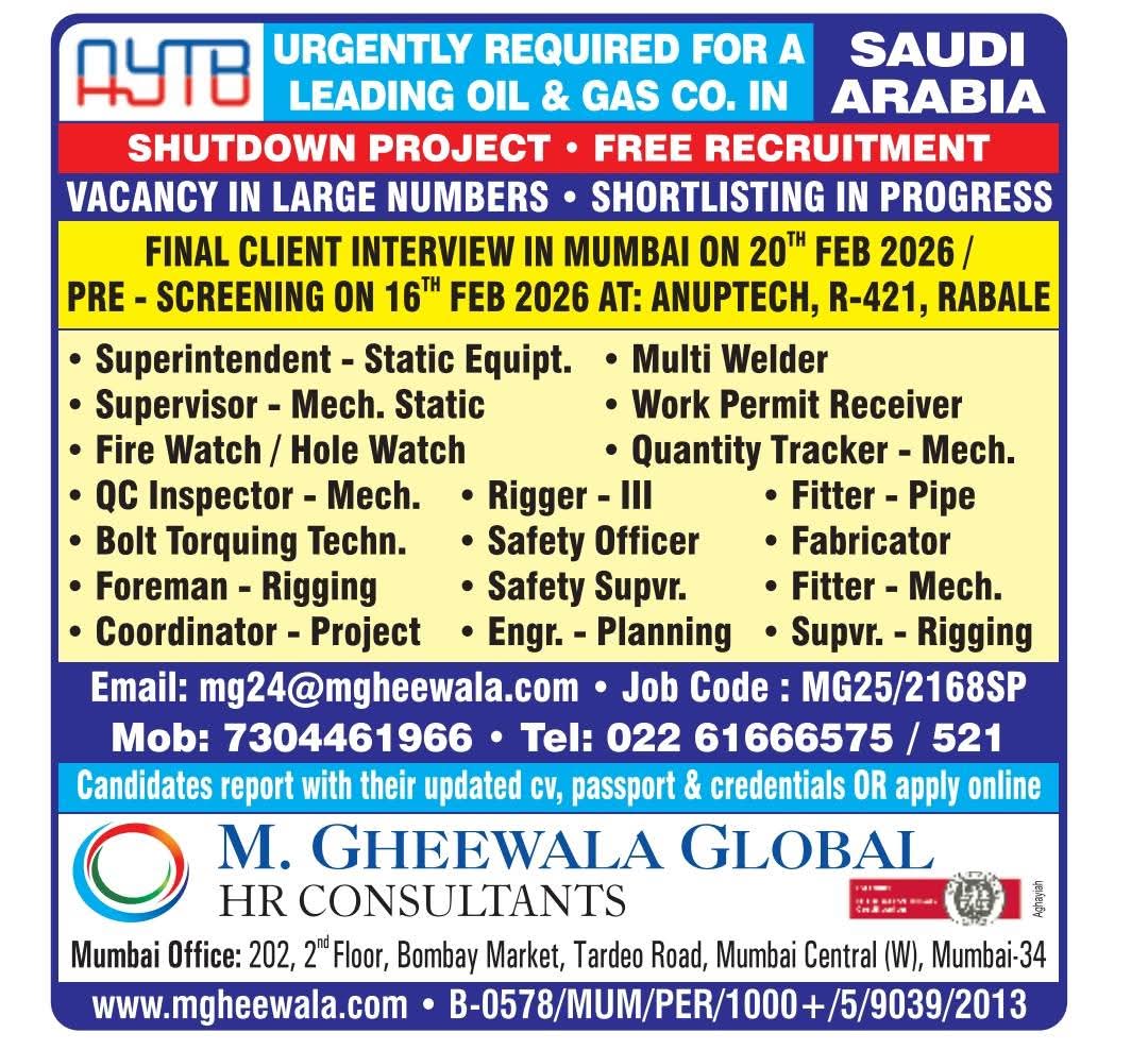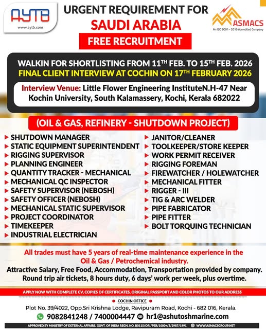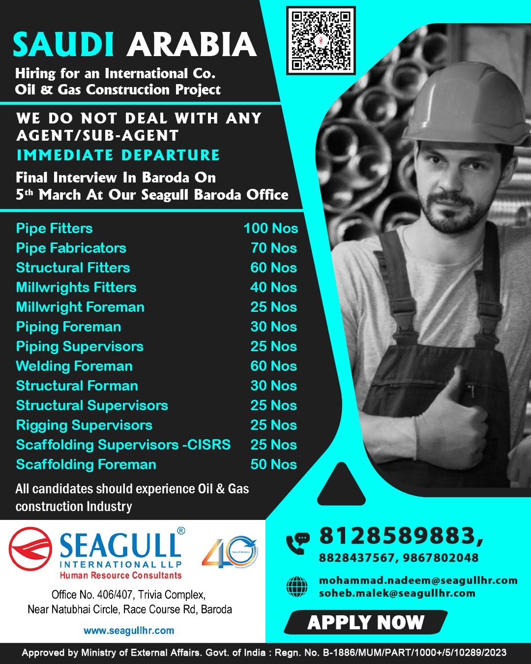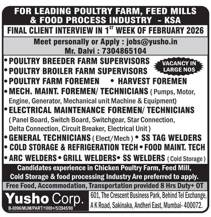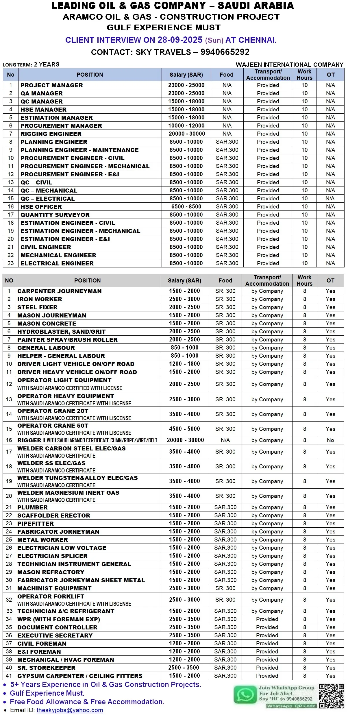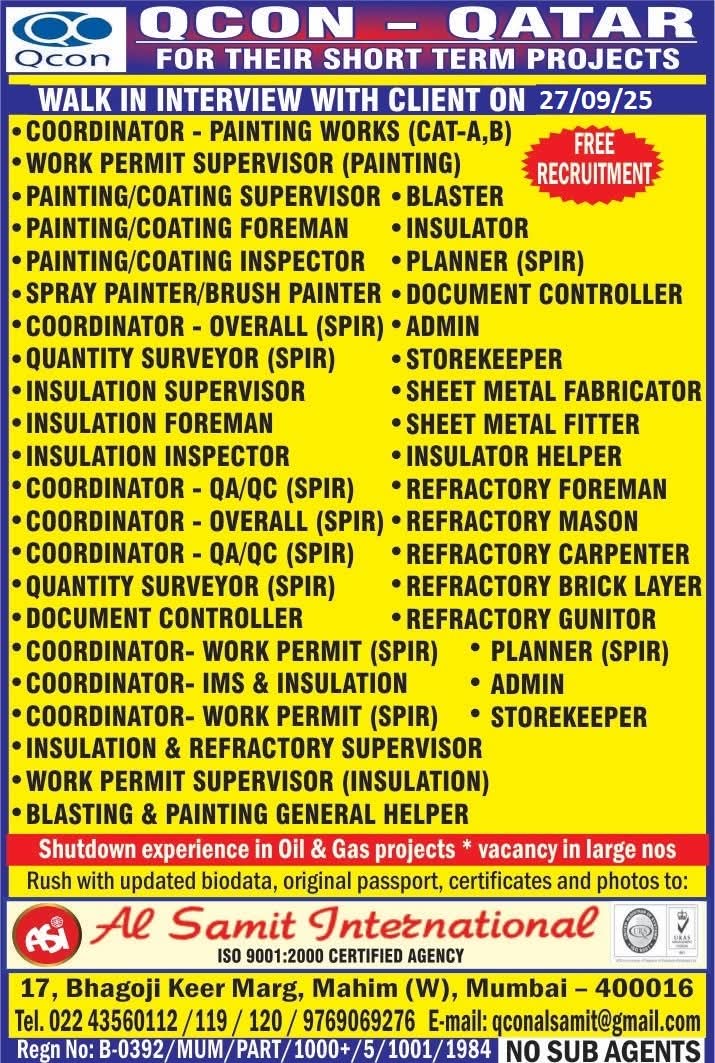 GULF EMPLOYMENT NEWSPAPER JOBS: Urgently Required for SAUDI ARABIA Min. 3 to 10 yrs preferably experience in Industry. WPR Work Permit Receiver-Aramco certificate, QA/QC Welding Engineer-Aramco Approved, QA/QC Piping Engineer-Aramco Approved, Scaffolders Labours Must with TUV Card, Scaffolding Supervisor-Aramco certificate, Support Sales Team Preferably Kerala & Degree, Indoor Salesman Preferably Kerala & Degree, Quality Engineer Experience at least 5 years in Concrete Batching Plant and Raw material, Lab Technician-Exp. in Concrete Batching plant, Pump operator-Exp. in Concrete Batching plant, Batching Plant operator-Exp. at least 2 years. Laundry Man/operators, Autocad -3D- Civil, Dozer operator, Haris/Watchman, Chef/Cooks, Return House Drivers Asst. Cooks, Pastry Chef/Bakers, Secretary, Unit Managers-Experience in catering. Block Visa Ready. Immediate Departure. Bring your CV Photos & Original Passport along with you. FAISA MANAGEMENT SERVICES Esjay House, Level 1 RM 4, Below Barkat English School, Maulana Azad Road Byculla Mumbai400 010. Tel 022 2307373, Mob 9022355544