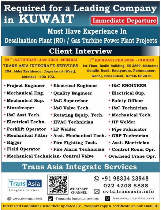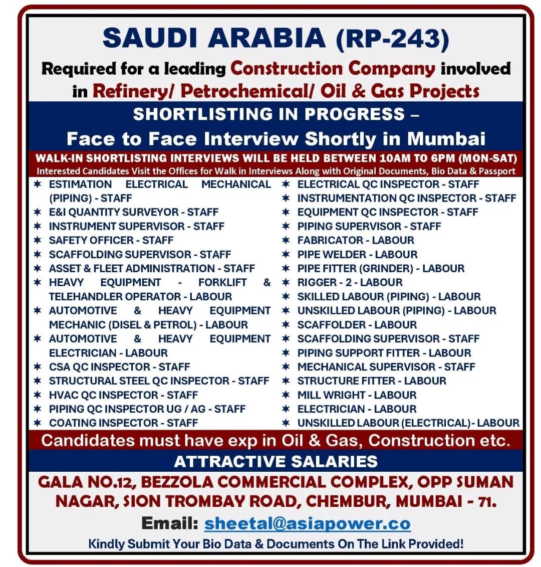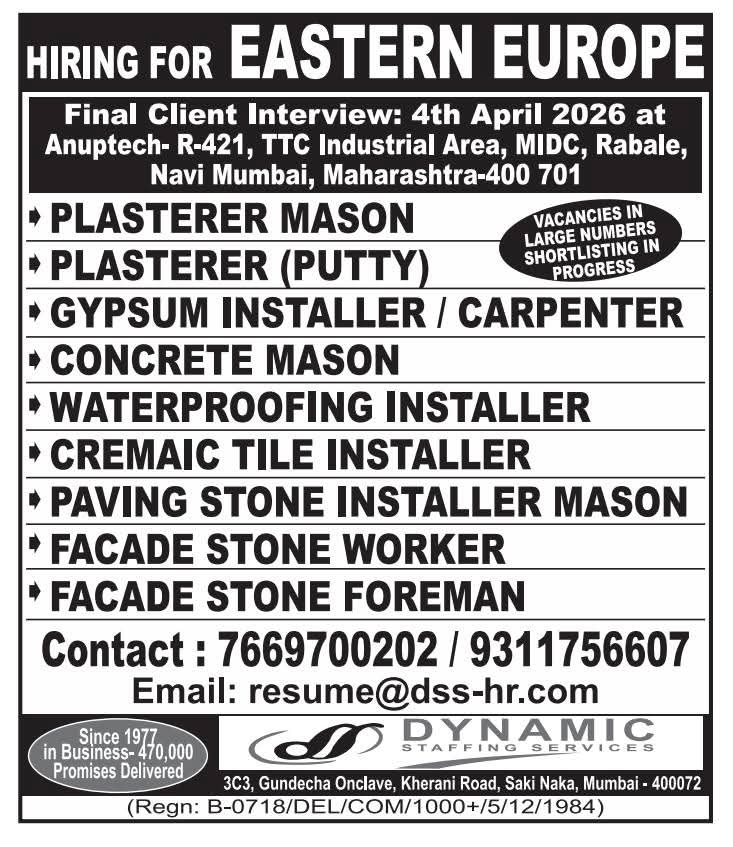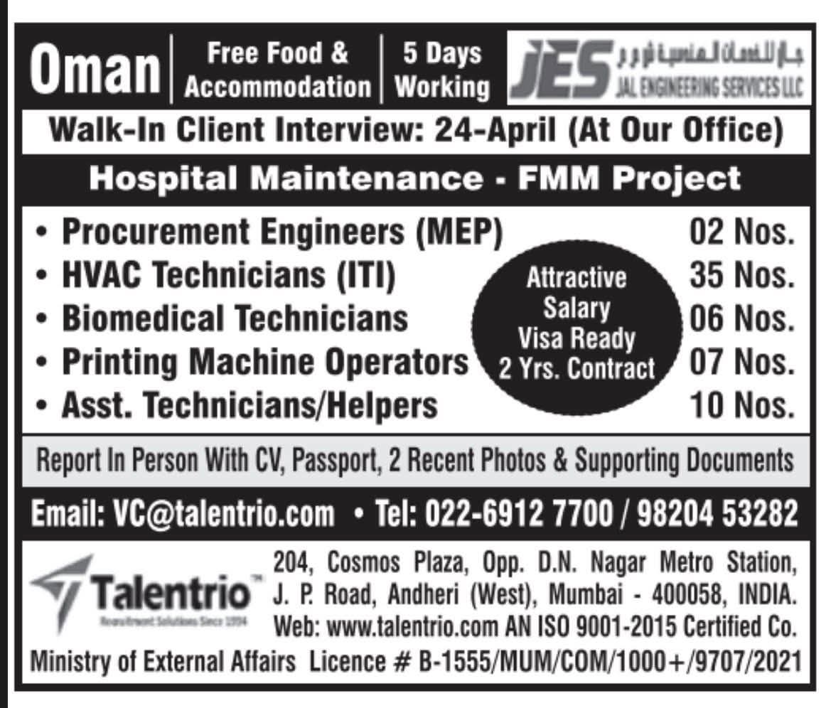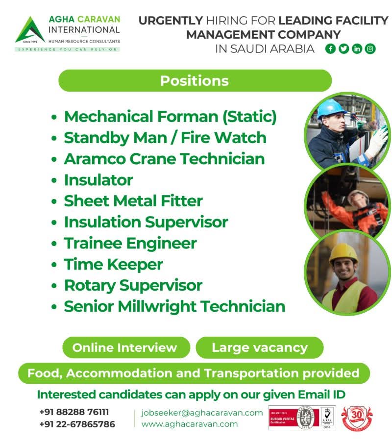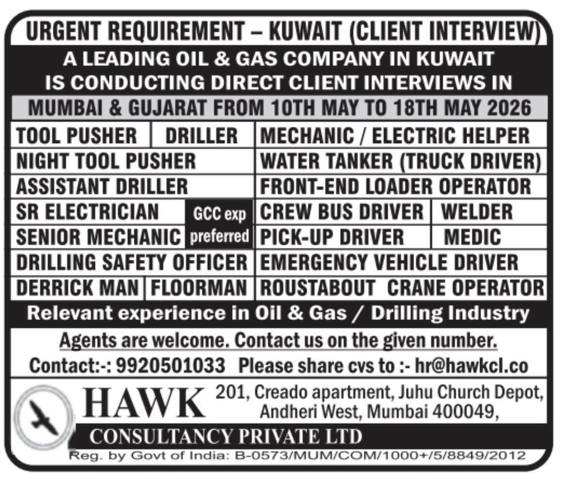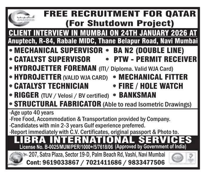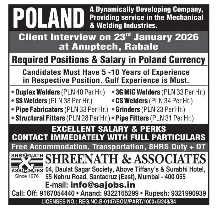 GULF EMPLOYMENT NEWSPAPER JOBS: Urgently Required for SAUDI ARABIA Min. 3 to 10 yrs preferably experience in Industry. WPR Work Permit Receiver-Aramco certificate, QA/QC Welding Engineer-Aramco Approved, QA/QC Piping Engineer-Aramco Approved, Scaffolders Labours Must with TUV Card, Scaffolding Supervisor-Aramco certificate, Support Sales Team Preferably Kerala & Degree, Indoor Salesman Preferably Kerala & Degree, Quality Engineer Experience at least 5 years in Concrete Batching Plant and Raw material, Lab Technician-Exp. in Concrete Batching plant, Pump operator-Exp. in Concrete Batching plant, Batching Plant operator-Exp. at least 2 years. Laundry Man/operators, Autocad -3D- Civil, Dozer operator, Haris/Watchman, Chef/Cooks, Return House Drivers Asst. Cooks, Pastry Chef/Bakers, Secretary, Unit Managers-Experience in catering. Block Visa Ready. Immediate Departure. Bring your CV Photos & Original Passport along with you. FAISA MANAGEMENT SERVICES Esjay House, Level 1 RM 4, Below Barkat English School, Maulana Azad Road Byculla Mumbai400 010. Tel 022 2307373, Mob 9022355544