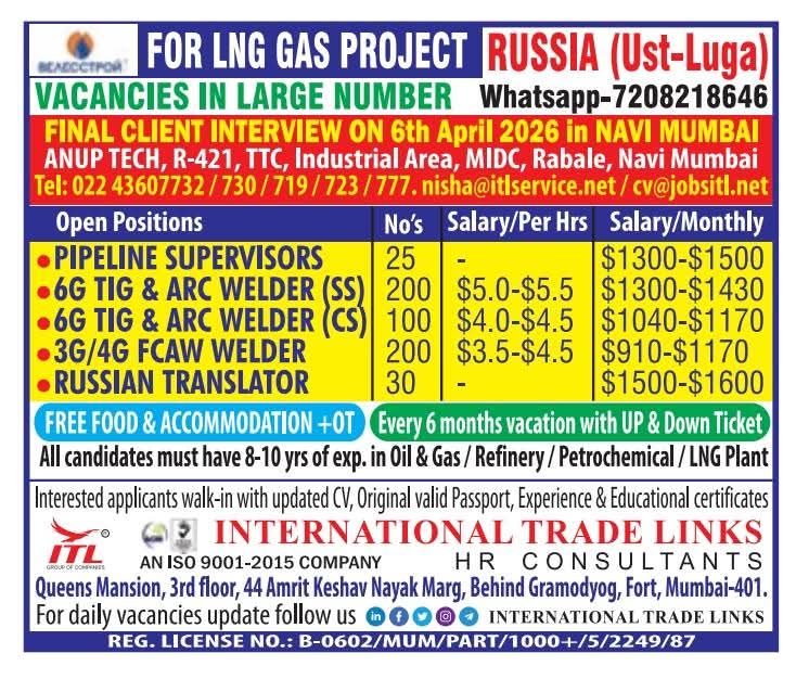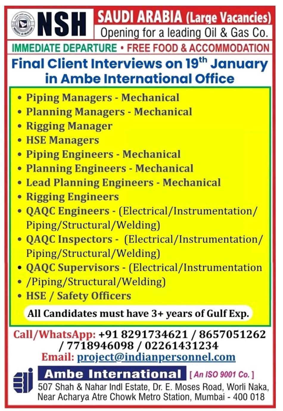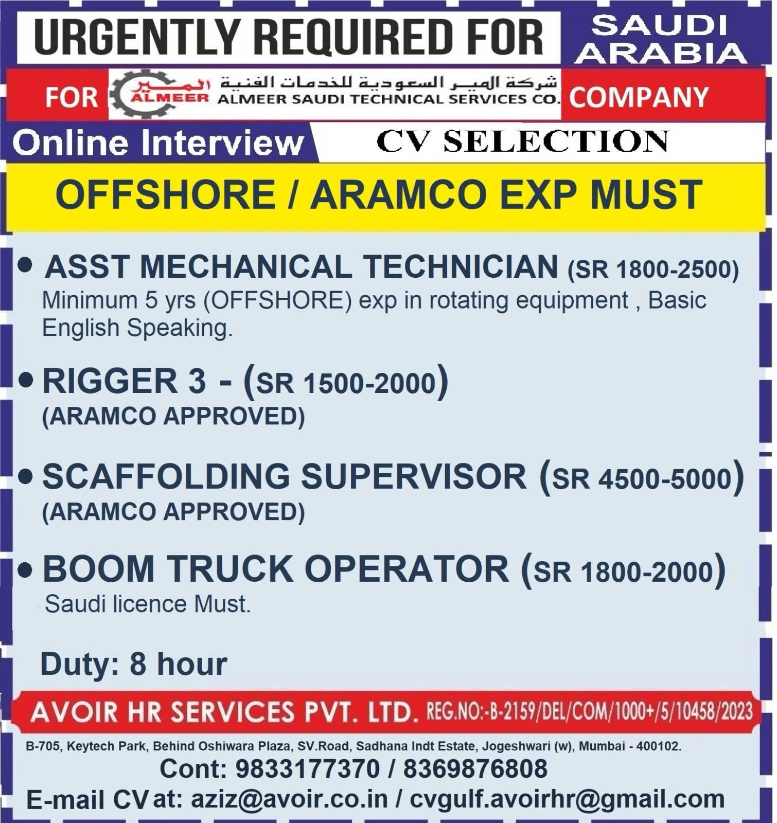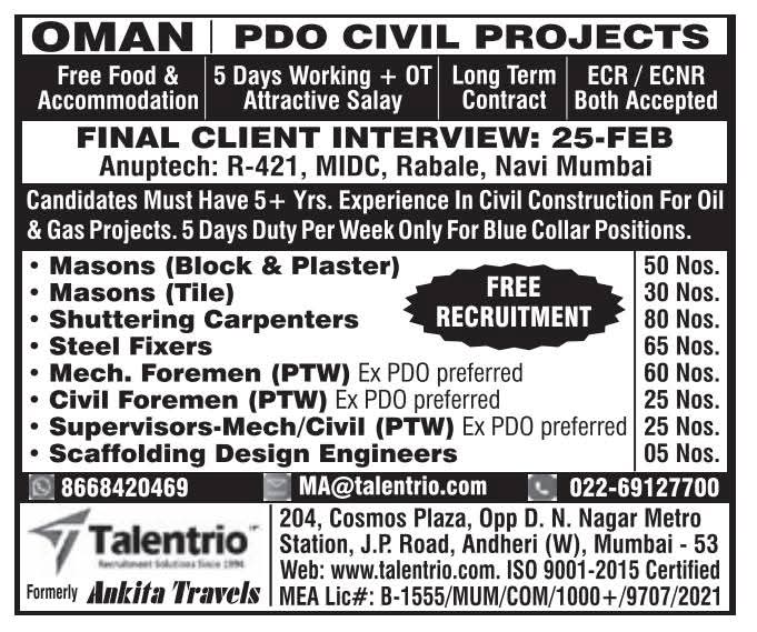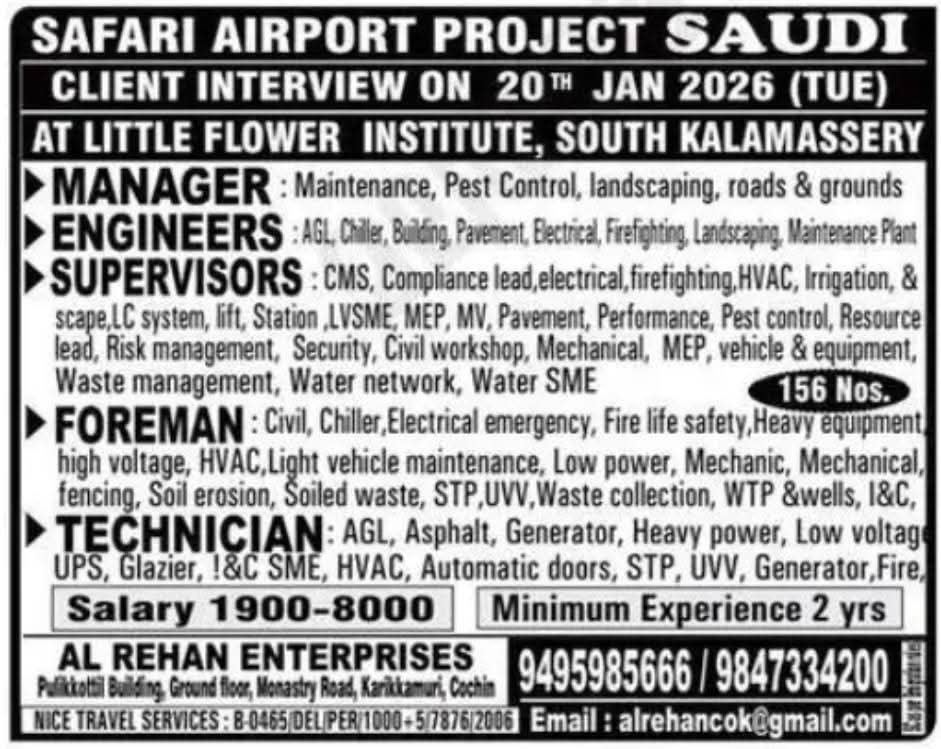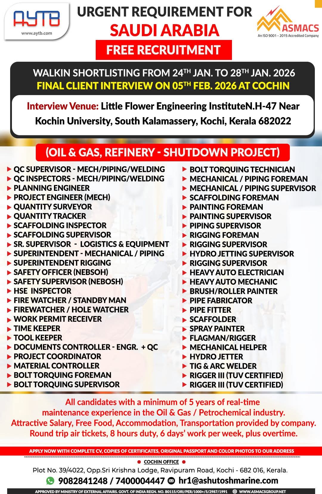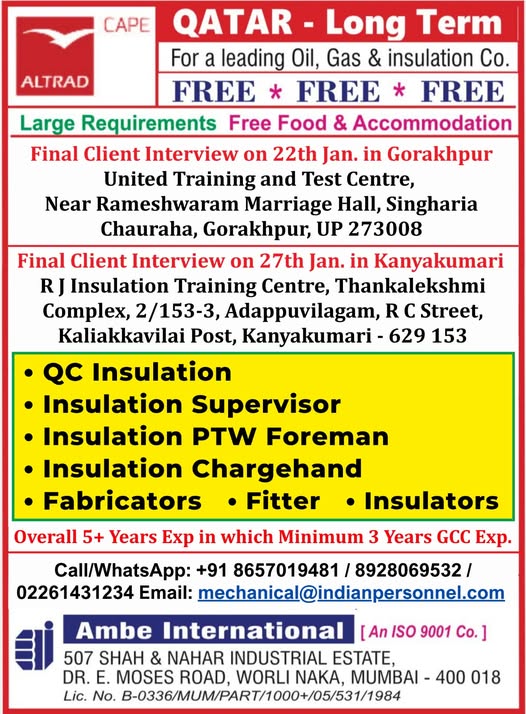 GULF EMPLOYMENT NEWSPAPER JOBS: Urgently Required for SAUDI ARABIA Min. 3 to 10 yrs preferably experience in Industry. WPR Work Permit Receiver-Aramco certificate, QA/QC Welding Engineer-Aramco Approved, QA/QC Piping Engineer-Aramco Approved, Scaffolders Labours Must with TUV Card, Scaffolding Supervisor-Aramco certificate, Support Sales Team Preferably Kerala & Degree, Indoor Salesman Preferably Kerala & Degree, Quality Engineer Experience at least 5 years in Concrete Batching Plant and Raw material, Lab Technician-Exp. in Concrete Batching plant, Pump operator-Exp. in Concrete Batching plant, Batching Plant operator-Exp. at least 2 years. Laundry Man/operators, Autocad -3D- Civil, Dozer operator, Haris/Watchman, Chef/Cooks, Return House Drivers Asst. Cooks, Pastry Chef/Bakers, Secretary, Unit Managers-Experience in catering. Block Visa Ready. Immediate Departure. Bring your CV Photos & Original Passport along with you. FAISA MANAGEMENT SERVICES Esjay House, Level 1 RM 4, Below Barkat English School, Maulana Azad Road Byculla Mumbai400 010. Tel 022 2307373, Mob 9022355544
