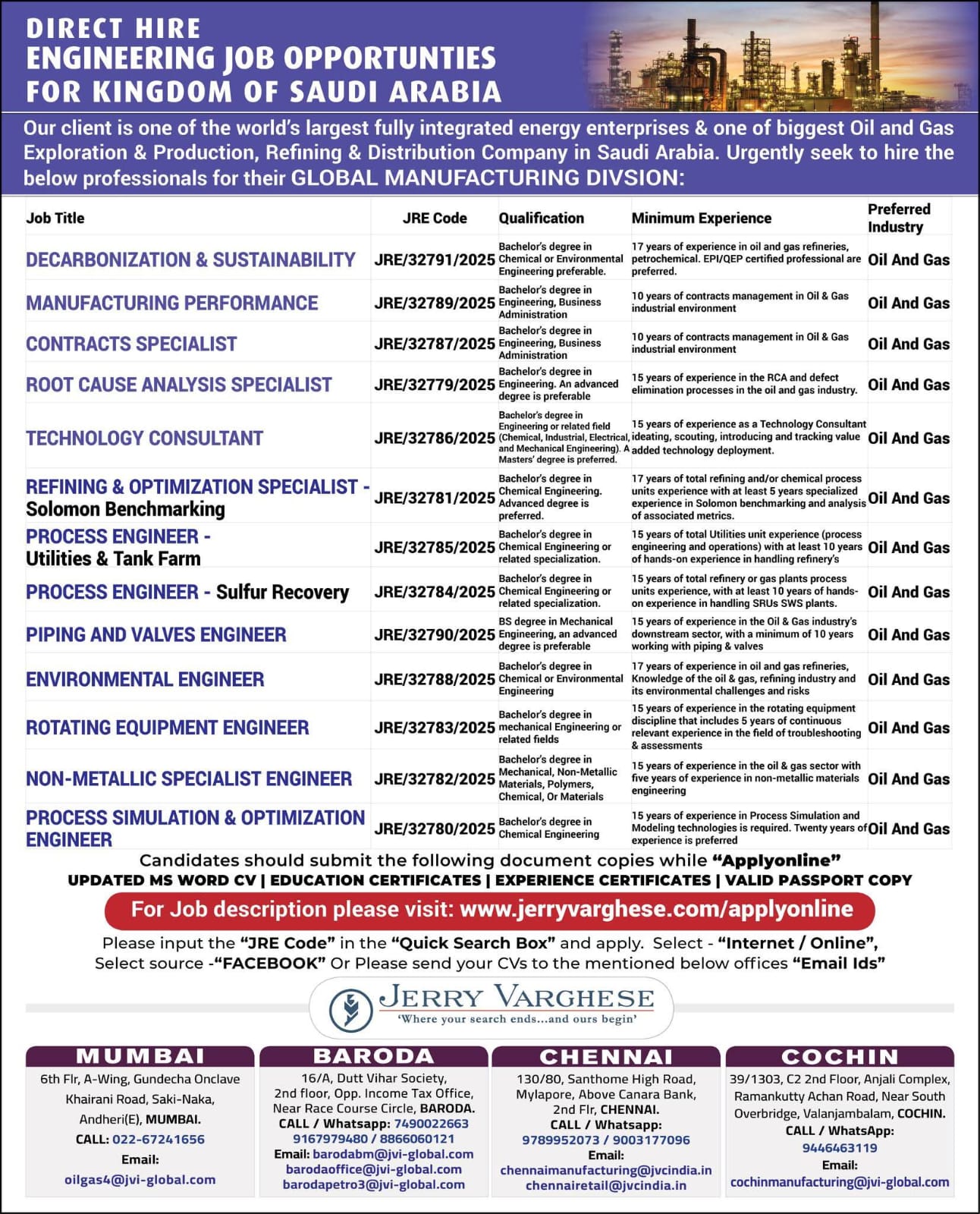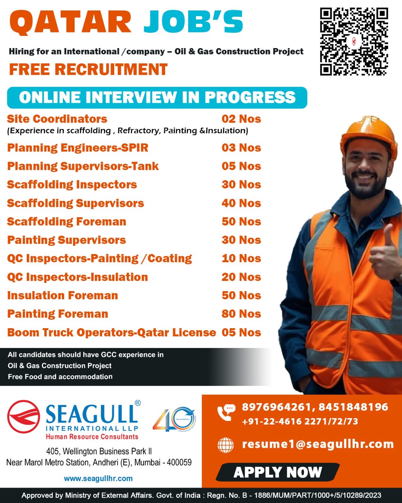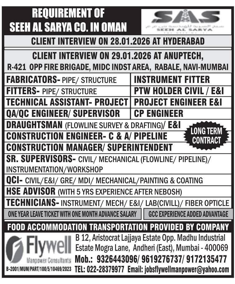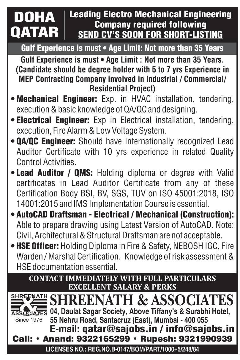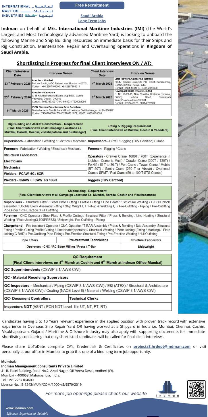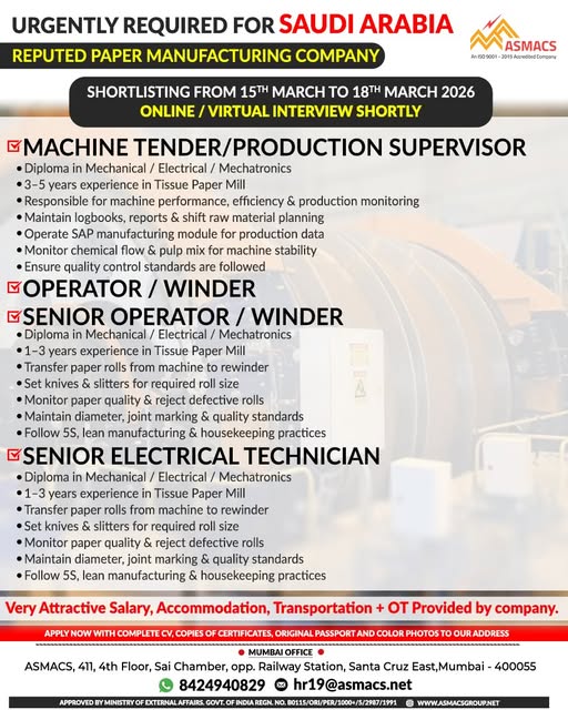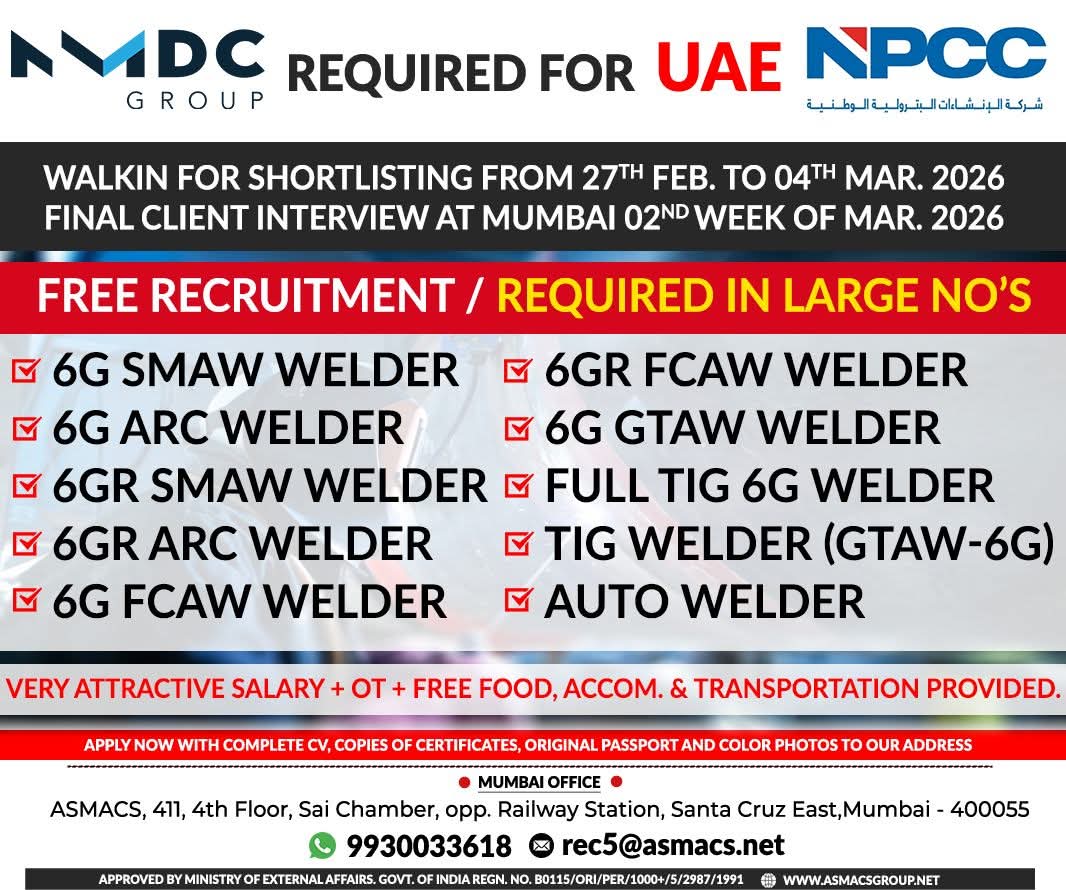 GULF EMPLOYMENT NEWSPAPER JOBS: Urgently Required for SAUDI ARABIA Min. 3 to 10 yrs preferably experience in Industry. WPR Work Permit Receiver-Aramco certificate, QA/QC Welding Engineer-Aramco Approved, QA/QC Piping Engineer-Aramco Approved, Scaffolders Labours Must with TUV Card, Scaffolding Supervisor-Aramco certificate, Support Sales Team Preferably Kerala & Degree, Indoor Salesman Preferably Kerala & Degree, Quality Engineer Experience at least 5 years in Concrete Batching Plant and Raw material, Lab Technician-Exp. in Concrete Batching plant, Pump operator-Exp. in Concrete Batching plant, Batching Plant operator-Exp. at least 2 years. Laundry Man/operators, Autocad -3D- Civil, Dozer operator, Haris/Watchman, Chef/Cooks, Return House Drivers Asst. Cooks, Pastry Chef/Bakers, Secretary, Unit Managers-Experience in catering. Block Visa Ready. Immediate Departure. Bring your CV Photos & Original Passport along with you. FAISA MANAGEMENT SERVICES Esjay House, Level 1 RM 4, Below Barkat English School, Maulana Azad Road Byculla Mumbai400 010. Tel 022 2307373, Mob 9022355544