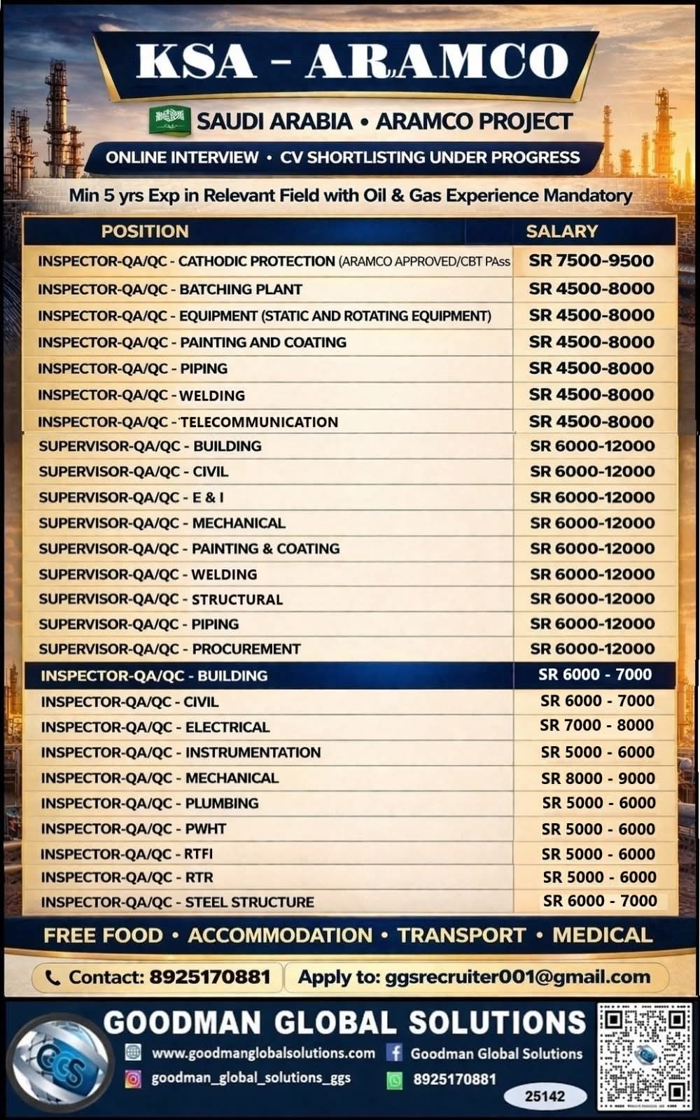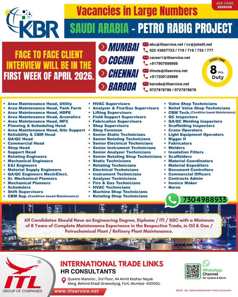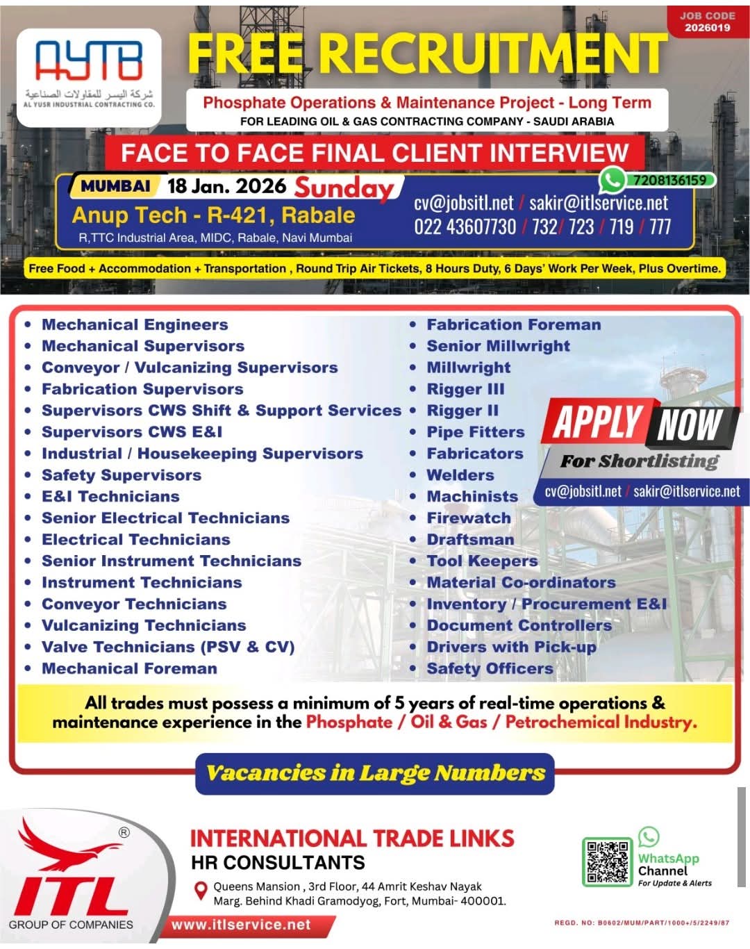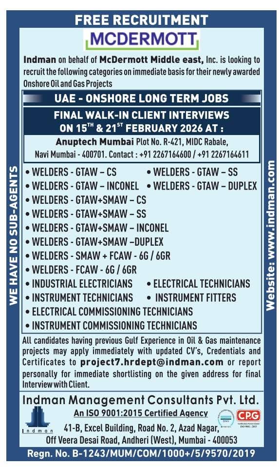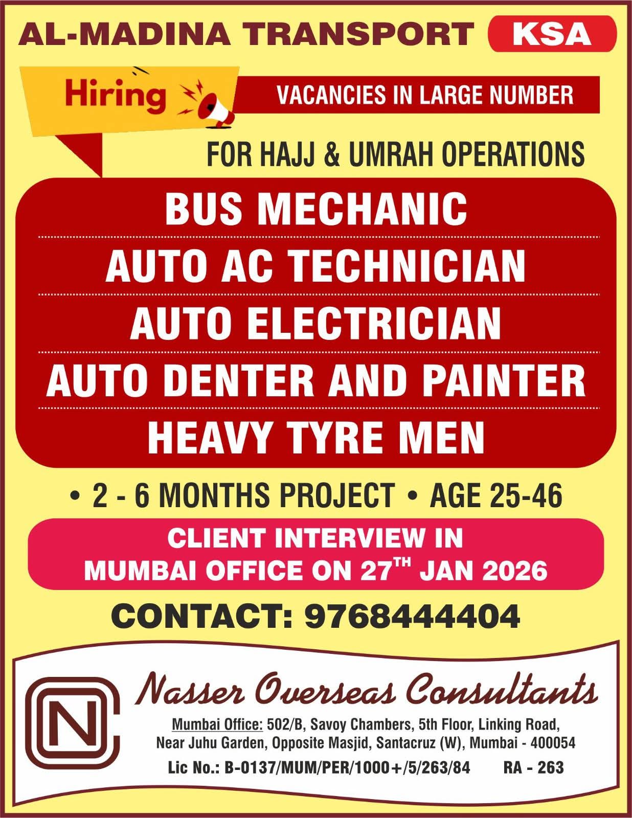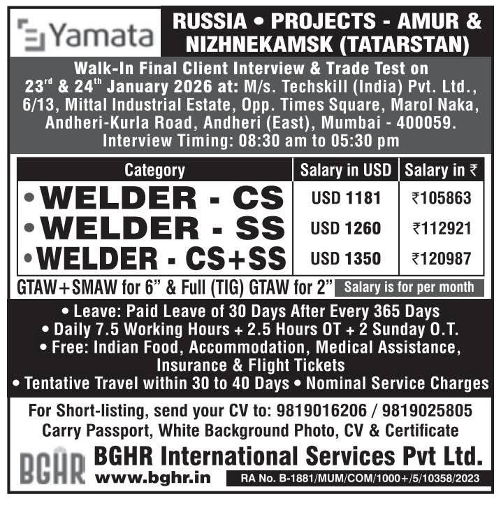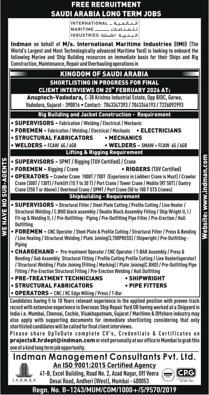 GULF EMPLOYMENT NEWSPAPER JOBS: Urgently Required for SAUDI ARABIA Min. 3 to 10 yrs preferably experience in Industry. WPR Work Permit Receiver-Aramco certificate, QA/QC Welding Engineer-Aramco Approved, QA/QC Piping Engineer-Aramco Approved, Scaffolders Labours Must with TUV Card, Scaffolding Supervisor-Aramco certificate, Support Sales Team Preferably Kerala & Degree, Indoor Salesman Preferably Kerala & Degree, Quality Engineer Experience at least 5 years in Concrete Batching Plant and Raw material, Lab Technician-Exp. in Concrete Batching plant, Pump operator-Exp. in Concrete Batching plant, Batching Plant operator-Exp. at least 2 years. Laundry Man/operators, Autocad -3D- Civil, Dozer operator, Haris/Watchman, Chef/Cooks, Return House Drivers Asst. Cooks, Pastry Chef/Bakers, Secretary, Unit Managers-Experience in catering. Block Visa Ready. Immediate Departure. Bring your CV Photos & Original Passport along with you. FAISA MANAGEMENT SERVICES Esjay House, Level 1 RM 4, Below Barkat English School, Maulana Azad Road Byculla Mumbai400 010. Tel 022 2307373, Mob 9022355544