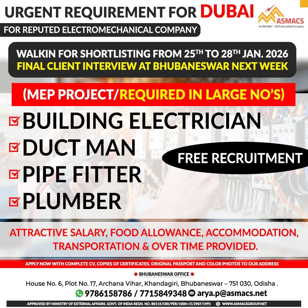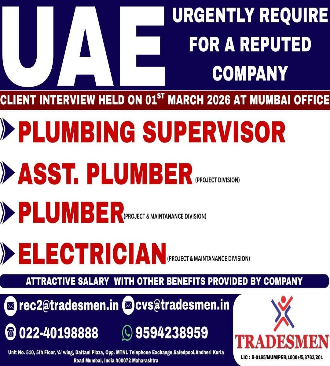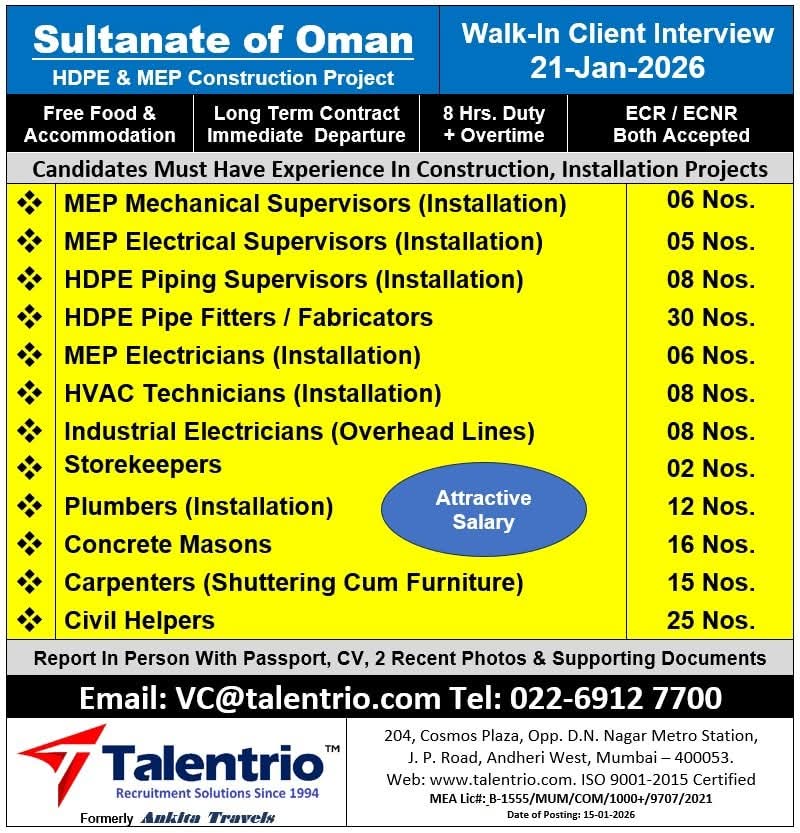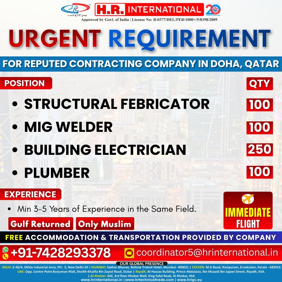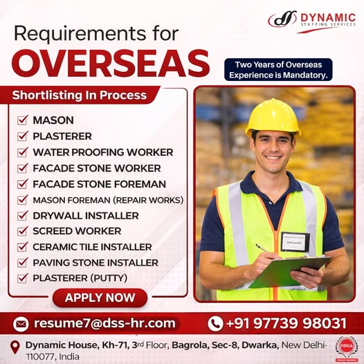 Hiring for multiple positions like Tile Mason,Shuttering Carpenter,Pipe Fitter,Plumber etc.Hiring for large Numbers.Immediate hiring.