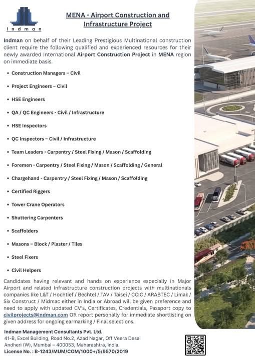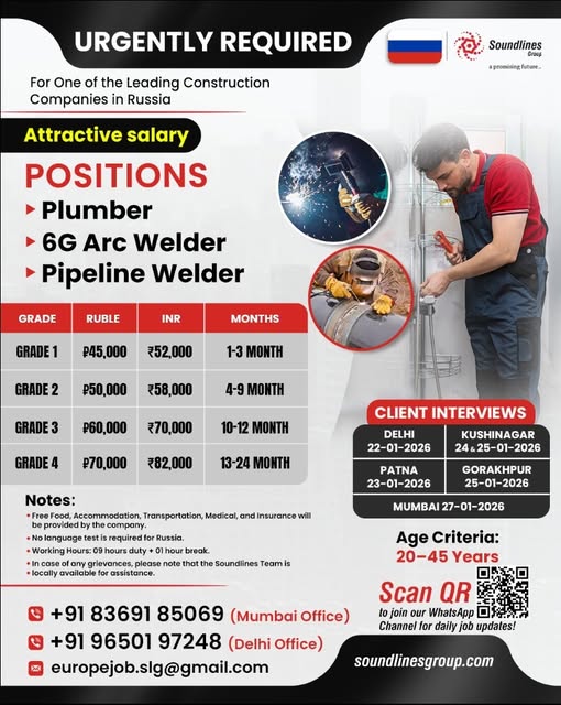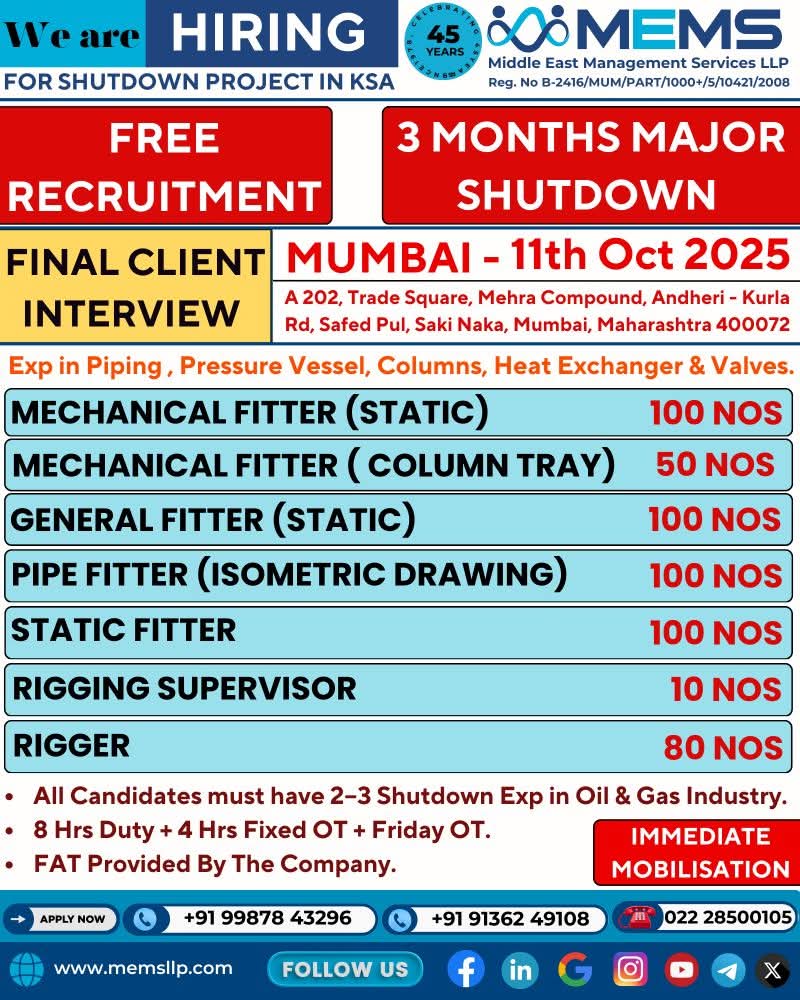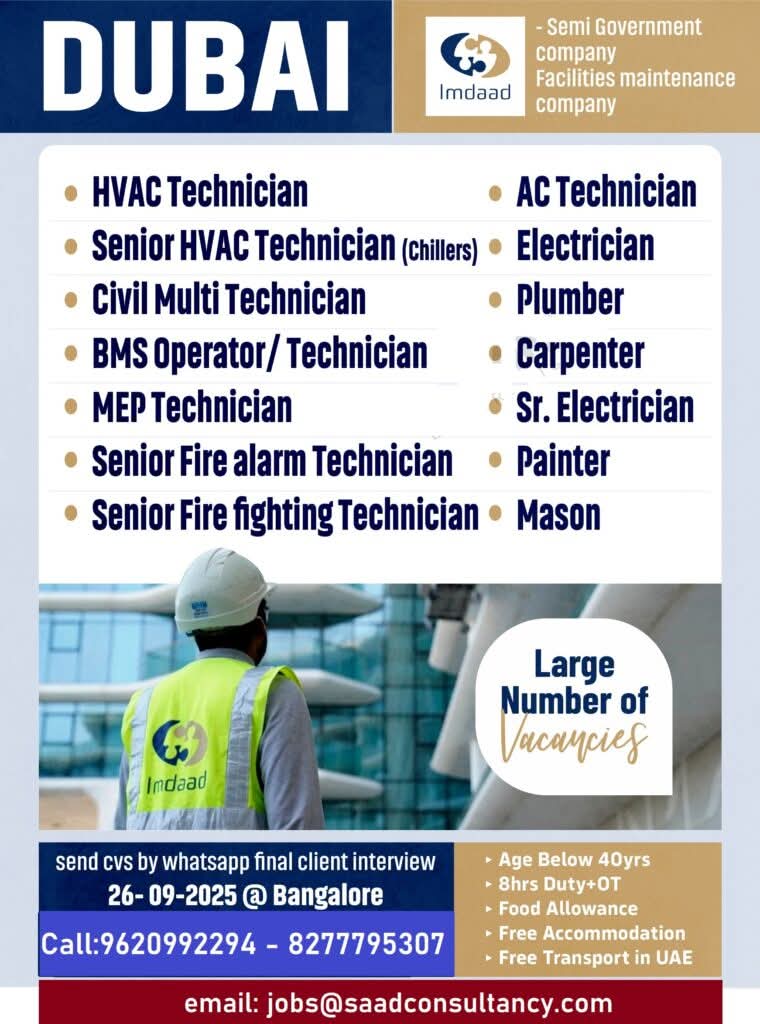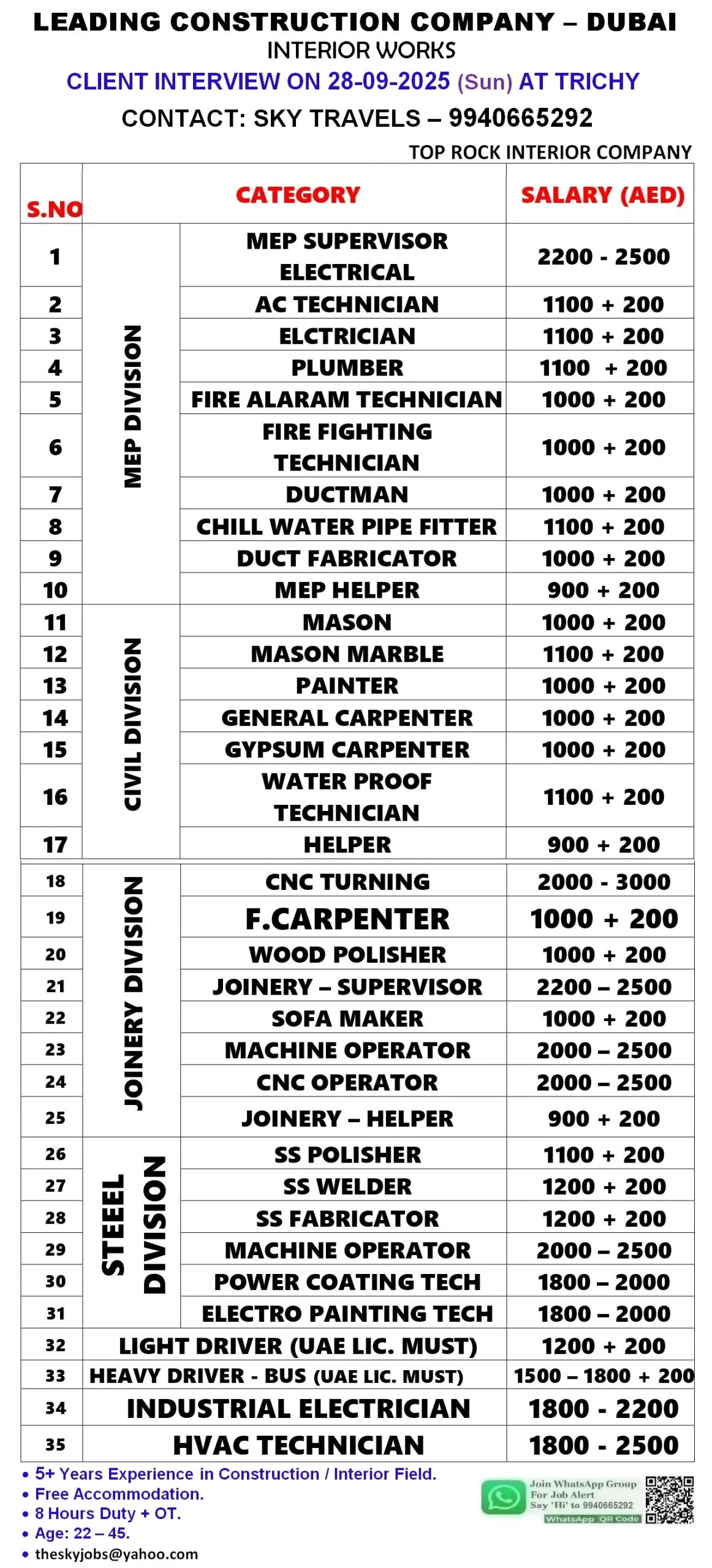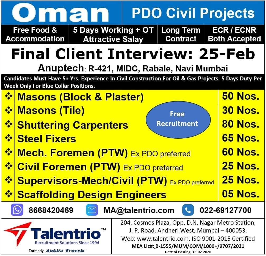 Hiring for multiple positions like Tile Mason,Shuttering Carpenter,Pipe Fitter,Plumber etc.Hiring for large Numbers.Immediate hiring.