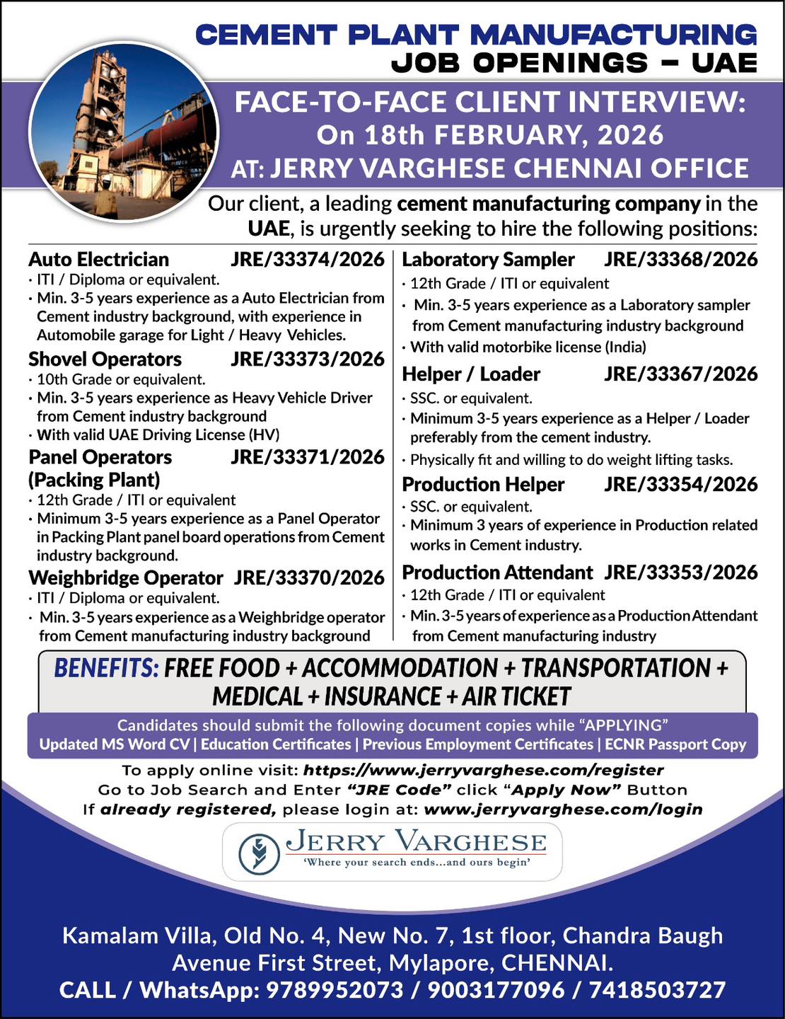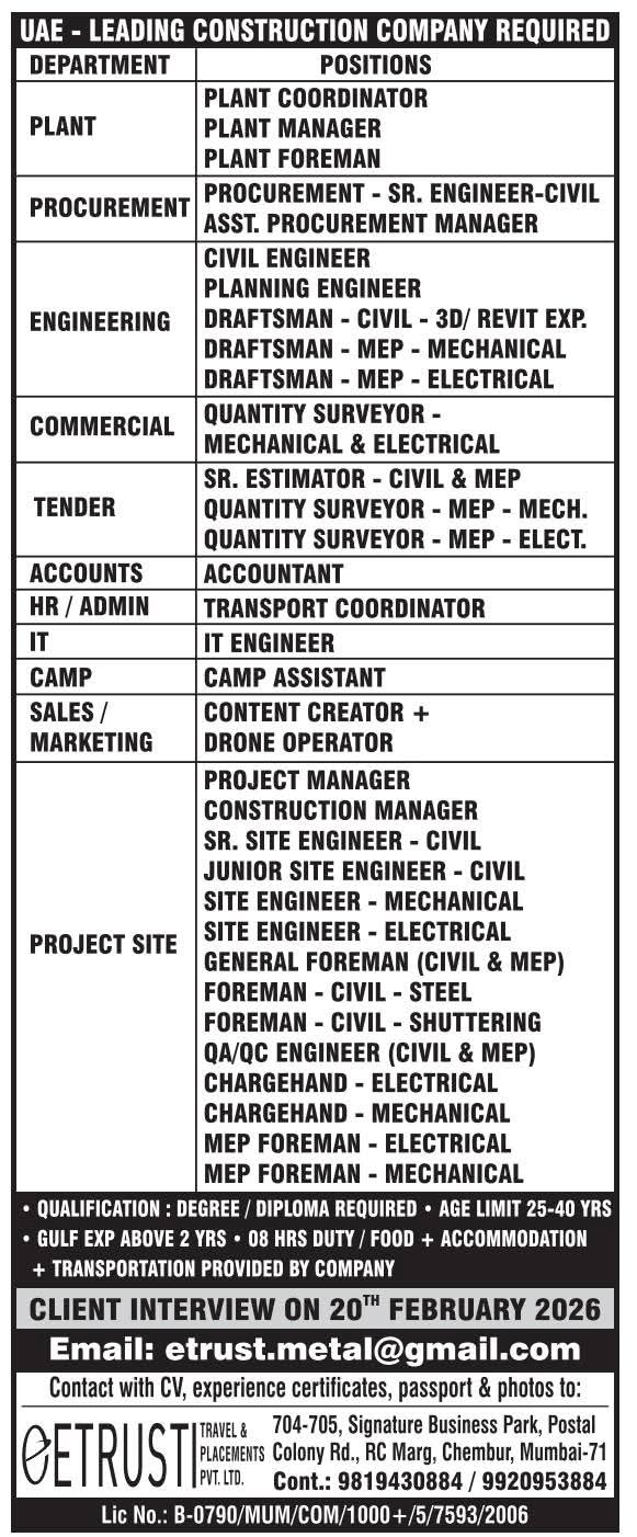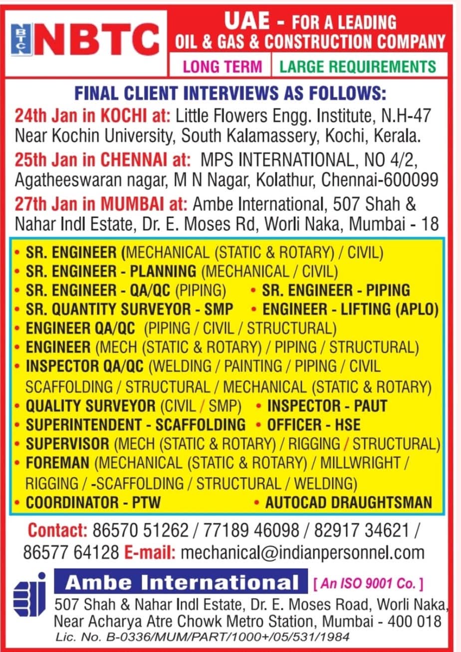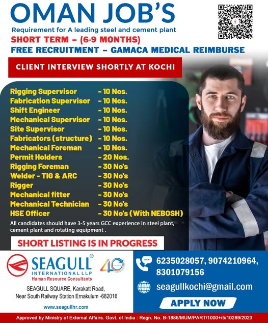 Latest GULF Employment News PAPER JOBS – UAE – SAFETY STEWARDS required Qualification is Diploma in Fire & Safety / Industrial Safety – IOSH / OHS / (NEBOSH – Preferred) minimum Years of Experience is required for this Job criteria. LAND SURVEYOR Proficient in using total Station, GPS and Knowledge of Auto CAD Preferred. CIVIL CHARGEHAND, MASONS TILES, MASONS (Block & Plaster), STEEL FIXERS, SHUTTERING CARPENTERS, PLUMBERS. ANGOLA – SALES EXECUTIVE candidate Should complete 12th with Computer knowledge, min 2 Years of Experience is required in retail / FMCG. INVENTORY EXECUTIVE required Educational criteria is B.Com. INDIAN COOK, CIVIL SITE SUPERVISOR, CIVIL ENGINEER required Qualification is Btech, PRODUCTION ENGG / CONTROLLER Candidate Should have a degree in Dip / B.tech / BE Mtech) Experience required in Steel Plant. Visit this site for more gulf daily news job vacancy classifieds that we have been regularly updating in this site.