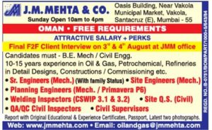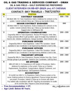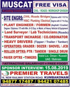 The interested candidates can walk-in with their relevant experience certificates and original passport.The candidates with Gulf Experience are preferred.