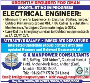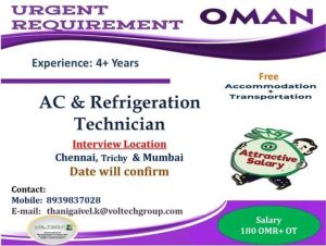 JOBS IN MUSCAT OMAN: Urgently wanted For SHORTLISTINGINPROGRES AC TECHNICIAN in Maintenance) (Centrifugal / Floatronic Chillers, VFD, Cooling Towers, AHUS, FCUS, Cold Rooms Maintenance Services) MECHANICAL TECHNICIAN (ITI 3 yrs diploma Above 3 in Maintenance) (Boilers / compressors / pumps / Medical Gases Equipment / Kitchen & Laundry Equipment / STP WTPIRO Plants, etc.,) ICAL TECHNICIAN ITI / 3 rs diploma Above 3 yrs exp. in Maintenance) (Sub Station, Transformer, UPS LVIV, Lighting Control System, Troubleshooting of Control wiring, Electrical Distribution System) 3 yrs exp. in Maintenance) (CCTV, Fire Alarm, PA & AV System, Power Electronics, Autogate System) send your resumes to SHORTLISTED CANDIDATES WILL BE INVITED FOR THE CLIENT INTERVIEW TENTATIVELY IN MARCH,2017. HSP No 9, Flat No. 4, Seva Apartments, Neelakanda Mehta CONSULTANTS Street, T.Nagar, Chennai 600017