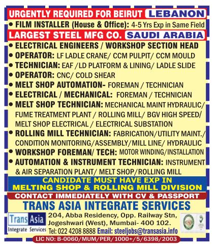 – CANDIDATE MUST HAVE EXP IN MELTING SHOP & ROLLING MILL DIVISION CONTACT IMMEDIATELY WITH CV & PASSPORT