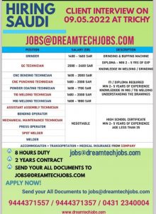 WALK IN INTERVIEW AT TRICHY FOR SAUDI ARABIA Post date: 08-05-22 Last date: 15-05-22 Related PostsANUPTECH INTERVIEWSASIA POWER GULF JOBS FOR INDIANSGULF EMPLOYMENT NEWSPAPER JOBS